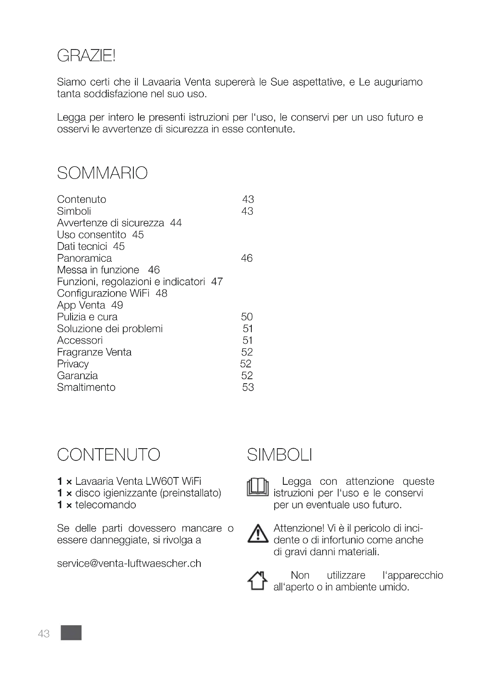 Problema Possibile soluzione L‘apparecchio non funziona. Inlare la spina elettrica nella presa. Inserire il connettore del cavo di alimentazione nell‘apparecchio. Se con l‘ausilio delle informazioni fornite non dovesse essere possibile risolvere il problema, rivolgersi al servizio di assistenza clienti VENTA: CH +41 41 781 15 15, www.venta-luftwaescher.ch ACCESSORI Articolo Unità di imballaggio / Pz. Disco Disco igienizzante 1 / 3 Detergente Detergente per apparecchi VENTA 1 Fragranze 3 Gli accessori possono essere ordinati telefonicamente oppure online. CH +41 41 781 15 15, www.venta-luftwaescher.ch52ITVenta LW60T WiFi FRAGRANZE VENTA Le fragranze Venta sono state sviluppate appositamente per la Venta Luftwäscher GmbH e sono composte al 100% da oli essenziali e da fragranze in armonia con la natura. Campo di impiego: Inserire solamente nel supporto fragranza previsto del Lavaa- ria/depuratore d‘aria (LW60T, LW60T WiFi, LW62 WiFi, LW62T WiFi, LP60, LP60 WiFi, LPH60 WiFi). Osservare le avvertenze contenute nelle istruzioni per l‘uso. Non aprire la capsula con la forza. Smaltimento: Smaltire le capsule di fragranza nei riuti domestici. Durata: Dopo l’apertura consumare entro 20 giorni. Dosaggio: Ruotando il cappuccio della fragranza è possibile regolare l‘intensità del profumo. PRIVACY I Suoi dati vengono trattati dalla Venta Luftwäscher in maniera riservata. Se i Suoi dati personali dovessero subire modiche o in caso di quesiti su come elaboriamo i Suoi dati, si rivolga al servizio di assistenza clienti Venta: CH +41 41 781 15 15, service@venta-luftwaescher.ch Per maggiori informazioni sul tema Privacy può consultare le nostre direttive sulla privacy al sito www.venta-luftwaescher.ch GARANZIA La ditta Venta-Luftwäscher GmbH ore 2 anni di garanzia su componenti difettosi e sui costi di lavoro del Suo lavaria. La garanzia è valida all‘interno dell‘Unione Europea. Per tutti gli altri Paesi la validità è esclusivamente limitata al Paese in cui l‘apparecchio è stato acquistato. Come certicato di garanzia è suciente mostra- re un valido scontrino di acquisto.53 SMALTIMENTO Il simbolo „pattumiera barrata“ richiede uno smaltimento separato di ap- parecchi elettrici ed elettronici usati (WEEE) come anche delle batterie/pile esauste. Simili apparecchi possono contenere sostanze pericolose e danno- se per l‘ambiente. Questi prodotti devono essere smaltiti presso un punto di raccolta per il riciclaggio di apparecchi elettrici ed elettronici e non devono essere smaltiti nei normali riuti domestici. Le batterie esauste non devono essere gettate nei riuti domestici. Esse devono essere conferite ai centri di raccolta o ai rivenditori. Così facendo si contribuisce alla protezione e alla salvaguardia delle risorse e dell‘ambiente. Per ulteriori informazioni rivolgersi agli enti preposti locali. In nessun caso i bambini devono giocare con sacchetti di plastica e materiale di imballaggio, in quanto vi è pericolo di infortunio o di soocamento. Conservare simile materiale in maniera sicura oppure smaltirlo in maniera ecosostenibile.