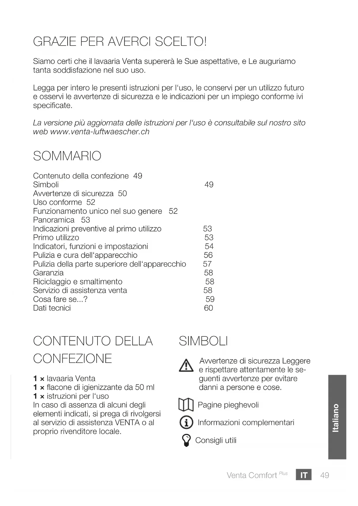 Consigli utili CONTENUTO DELLA CONFEZIONE 1 × lavaaria Venta1 × acone di igienizzante da 50 ml1 × istruzioni per l‘usoIn caso di assenza di alcuni degli elementi indicati, si prega di rivolgersi al servizio di assistenza VENTA o al proprio rivenditore locale. SOMMARIO Contenuto della confezione 49Simboli 49Avvertenze di sicurezza 50Uso conforme 52Funzionamento unico nel suo genere 52Panoramica 53Indicazioni preventive al primo utilizzo 53Primo utilizzo 53Indicatori, funzioni e impostazioni 54Pulizia e cura dell‘apparecchio 56Pulizia della parte superiore dell‘apparecchio 57Garanzia 58Riciclaggio e smaltimento 58Servizio di assistenza venta 58Cosa fare se...? 59Dati tecnici 6050 IT ∙ Questo apparecchio è idoneo all‘uso da parte di bambini con un‘età minima di 8 anni e da parte di persone con capacità siche, sen- soriali o mentali limitate oppure in possesso di poca esperienza e di conoscenze in materia ridotte, sempre che essi/esse vengano supervisionati o che siano stati istruiti in merito al suo utilizzo e che abbiano compreso i possibili pericoli. ∙ Leggere per intero le istruzioni per l‘uso prima di mettere in funzione l‘apparecchio e conservarle in buone condizioni per una eventuale consultazione futura. ∙ L‘apparecchio non è un giocattolo per bambini. ∙ La pulizia e la cura da parte dell‘utilizzatore non deve essere esegui- ta da bambini di età inferiore agli 8 anni o senza supervisione. ∙ Tenere lontano l‘apparecchio l’alimentatore a spina dai bambini di età inferiore agli 8 anni. ∙ Un uso improprio può danneggiare l‘apparecchio e causare lesioni corporee. ∙ Collegare l‘apparecchio solamente a prese di corrente idonee – Fare attenzione che la tensione di rete corrisponda a quella riportata sulla targhetta di omologazione applicata all‘apparecchio. ∙ Il Venta-Lavaaria deve essere fatto funzionare solo con l’alimentato- re a spina “Modello n. BI13-240050... / FJ-SW198240050...”. ∙ Non mettere mai in funzione il Venta-Lavaaria se un cavo o l’alimen- tatore a spina è danneggiato. ∙ Prima di qualsiasi operazione di pulizia o manutenzione oppure spostamento o trasporto dell’apparecchio, staccare l’alimentatore a spina dalla presa. ∙ Non mettere mai in funzione il Lavaaria dopo che è caduto per terra o se è stato danneggiato in altra maniera. AVVERTENZE DI SICUREZZA51ITVenta Comfort Plus Italiano ∙ Le riparazioni di apparecchi elettrici devono essere eseguite sola- mente da persone qualicate. Delle riparazioni non eseguite a rego- la d‘arte possono generare notevoli pericoli per l‘utilizzatore. ∙ Non sedersi assolutamente sull‘apparecchio e non appoggiarvi so- pra degli oggetti. ∙ Non inlare oggetti estranei nell‘apparecchio. Non immergere mai la parte superiore dell’apparecchio nell’acqua o in altri liquidi. ∙ Non riempire mai troppo il Lavaaria. ∙ Non trasportare mai né ribaltare il Lavaaria con il contenitore pieno. ∙ Non staccare mai l’alimentatore a spina dalla presa aerrandolo per il cavo o con mani bagnate. ∙ Il Lavaaria deve essere messo in funzione solamente se completa- mente montato. ∙ Appoggiare il Lavaaria solo su di una supercie piana ed asciutta. ∙ Posizionare l‘apparecchio in maniera tale che non possa essere ribaltato e che nessuno possa inciampare nell‘apparecchio o nel cavo. Mantenere una distanza di almeno 50 cm da oggetti e pareti. ∙ Non coprire mai né bloccare le fessure di ventilazione, al ne di evi- tare un surriscaldamento/danneggiamento dell‘apparecchio. ∙ Aggiungere all’acqua solo additivi originali Venta. La Venta-Luftwäscher GmbH non risponde dei danni derivanti dall’uso di altri additivi. ∙ Se l’apparecchio non viene usato, staccare l’alimentatore a spina dalla presa.52 IT USO CONFORME Il Lavaaria Venta è un elettrodomestico per l‘umidificazione e la depurazione dell‘aria per ambienti abitativi, di lavoro e di soggiorno. L‘apparecchio non è idoneo all‘uso esterno. Qualsiasi altro uso o modica all‘appa- recchio sono da considerarsi uso non consentito. Il produttore non risponde per danni o per lesioni causati da un uso improprio. Un uso non consentito può mettere in pericolo la salute e la vita delle persone. Fra tale tipo di uso si conta: ∙ in locali con atmosfere a rischio di esplosione e/o con atmosfera ag- gressiva. ∙ in ambienti con elevata concentrazio- ne di solventi. ∙ in prossimità di piscine o di terreni bagnati. EGREGIO CLIENTE, complimenti per aver scelto un apparecchio VENTA LW15 / LW25 / LW45 COMFORT Plus : un prodotto eccellente e di grande ecienza, che Le permetterà di umidicare e depurare l‘aria, creando la Sua atmosfera ideale. FUNZIONAMENTO UNICO NEL SUO GENERE: l‘aria secca e viziata presente nell‘ambiente viene convogliata nell‘apparecchio, dove transita attraverso una batteria di dischi rotanti in acqua. L‘acqua pura presente nel dispositivo evapora, portando automaticamente al livello corretto il grado di umidità dell‘aria ambiente con un metodo, quello dell‘evaporazione a freddo, ritenuto comunemente il migli- ore e in grado di escludere un‘umidicazione eccessiva e la formazione di depositi di calcare. Allo stesso tempo si produce anche una depurazione dell‘aria ambi- ente. L‘acqua trattiene infatti anche le particelle di sporco più minute, no a 10 μm (10/1000 mm), senza necessità di ltri, che tendono a sporcarsi con il tempo. Qui, il ltro è l‘acqua: ogni giorno rinnovata e fresca per mantenere anno dopo anno il suo elevato potere di umidicazione e depurazione. DISPLAY TOUCH INTUITIVO con comodi indicatori e agevole inserimento delle impostazioni: ∙ visualizzazione dell‘umidità relativa dell‘aria ambiente ∙ promemoria per un esercizio continuo igienico e ineccepibile ∙ modalità Sleep per notti piacevolmente tranquille ∙ ciclo Auto per la regolazione automatica del livello di giri ∙ indicatore di acqua insuciente con spegnimento automatico dell