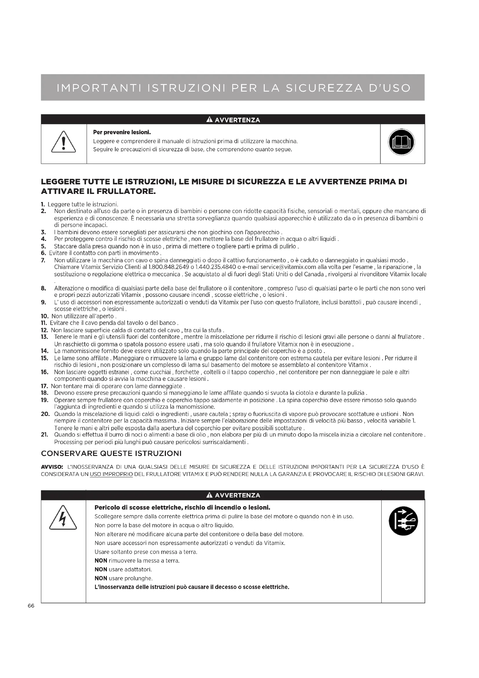 AVVERTENZA Per prevenire lesioni. Leggere e comprendere il manuale di istruzioni prima di utilizzare la macchina.Seguire le precauzioni di sicurezza di base, che comprendono quanto segue. AVVERTENZA Pericolo di scosse elettriche, rischio di incendio o lesioni. Scollegare sempre dalla corrente elettrica prima di pulire la base del motore o quando non è in uso.Non porre la base del motore in acqua o altro liquido. Non alterare né modificare alcuna parte del contenitore o della base del motore. Non usare accessori non espressamente autorizzati o venduti da Vitamix. Usare soltanto prese con messa a terra. NON rimuovere la messa a terra. NON usare adattatori. NON usare prolunghe. L'inosservanza delle istruzioni può causare il decesso o scosse elettriche.