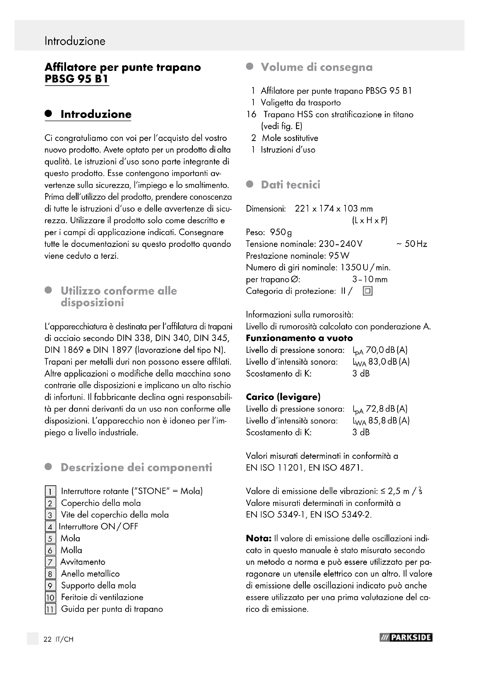 Volume di consegna 1 Affilatore per punte trapano PBSG 95 B1 1 Valigetta da trasporto 16 Trapano HSS con stratificazione in titano (vedi fig. E) 2 Mole sostitutive 1 Istruzioni d’uso