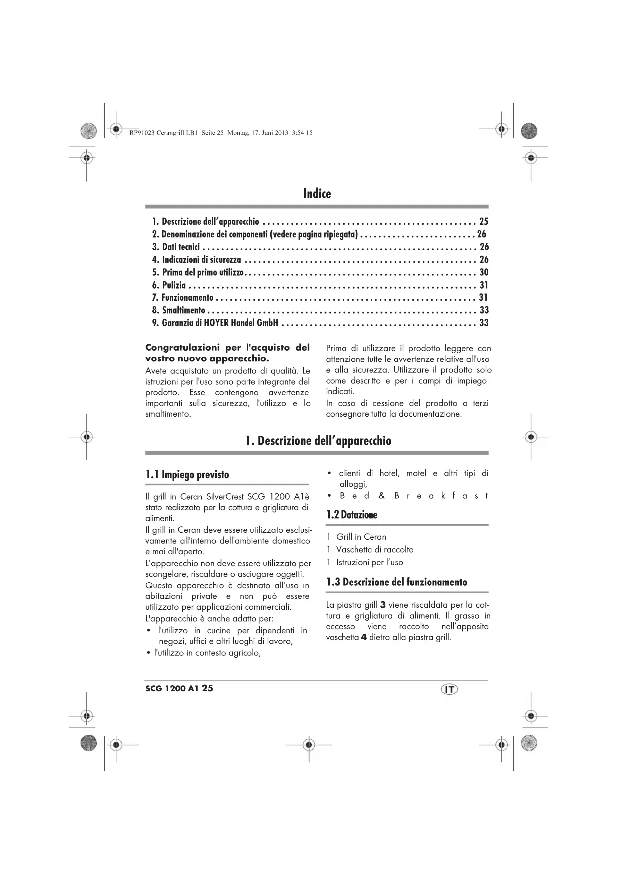 Gentile cliente, questo apparecchio è accompagnato da una garanzia di 3 anni a partire dalla data di acquisto. In caso di difetti del prodotto può far valere i Suoi diritti nei confronti del venditore come previsto dalla legge. Tali diritti di legge non sono limitati dalla nostra garanzia, descritta di seguito in dettaglio. Condizioni di garanzia Il periodo di garanzia ha inizio dalla data di acquisto. Conservare pertanto lo scontrino di cassa originale, in quanto documento comprovante l'acquisto. Se entro tre anni dalla data di acquisto di questo prodotto insorge un difetto di materiale o di fabbricazione, ci impegniamo a riparare o a sostituire a nostra scelta il prodotto. La prestazioni di garanzia presuppone, entro il termine di tre anni, la presentazione dell'apparecchio difettoso e della prova di acquisto (scontrino di cassa) e una breve descrizione scritta del difetto e del momento in cui è insorto. Se il difetto è coperto dalla nostra garanzia, ci impegniamo a rispedire il prodotto riparato o un nuovo prodotto. Con la riparazione o la sostituzione del prodotto non decorre un nuovo periodo di garanzia. Periodo di garanzia e rivendicazioni per difetti Il periodo di garanzia non viene prolungato dalla prestazione di garanzia. Questo vale anche per le parti sostituite e riparate. Eventuali danni o difetti riscontrati già al momento dell'acquisto devono essere comunicati subito dopo l'apertura della confezione. Dopo lo scadere del periodo di garanzia le riparazioni vengono effettuate a pagamento. RP91023 Cerangrill LB1 Seite 33 Montag, 17. Juni 2013 3:54 1534 Ambito della garanzia L’apparecchio è stato prodotto rispettando i più severi standard di qualità ed è stato scrupolosamente testato prima della spedizione. La garanzia copre i difetti di materiale o di fabbricazione. Non si estende alle parti del prodotto soggette a normale usura e considerate pertanto parti usurabili, né ai danni ai componenti più fragili, ad es. interruttori, batterie o parti in vetro. La garanzia decade se il prodotto viene danneggiato, utilizzato o sottoposto a manutenzione in modo non conforme. Per un utilizzo conforme del prodotto è necessario attenersi a tutte le avvertenze contenute nelle istruzioni per l'uso. Sono assolutamente da evitare gli utilizzi e le azioni che le istruzioni per l'uso sconsigliano. Il prodotto è concepito esclusivamente per l’uso privato, non per quello commerciale. La garanzia decade in caso di utilizzo indebito e non conforme, uso della forza e interventi non effettuati dal nostro centro d'assistenza autorizzato. Svolgimento della garanzia Per garantire una rapida evasione della richiesta del cliente, si consiglia di attenersi alla procedura seguente: