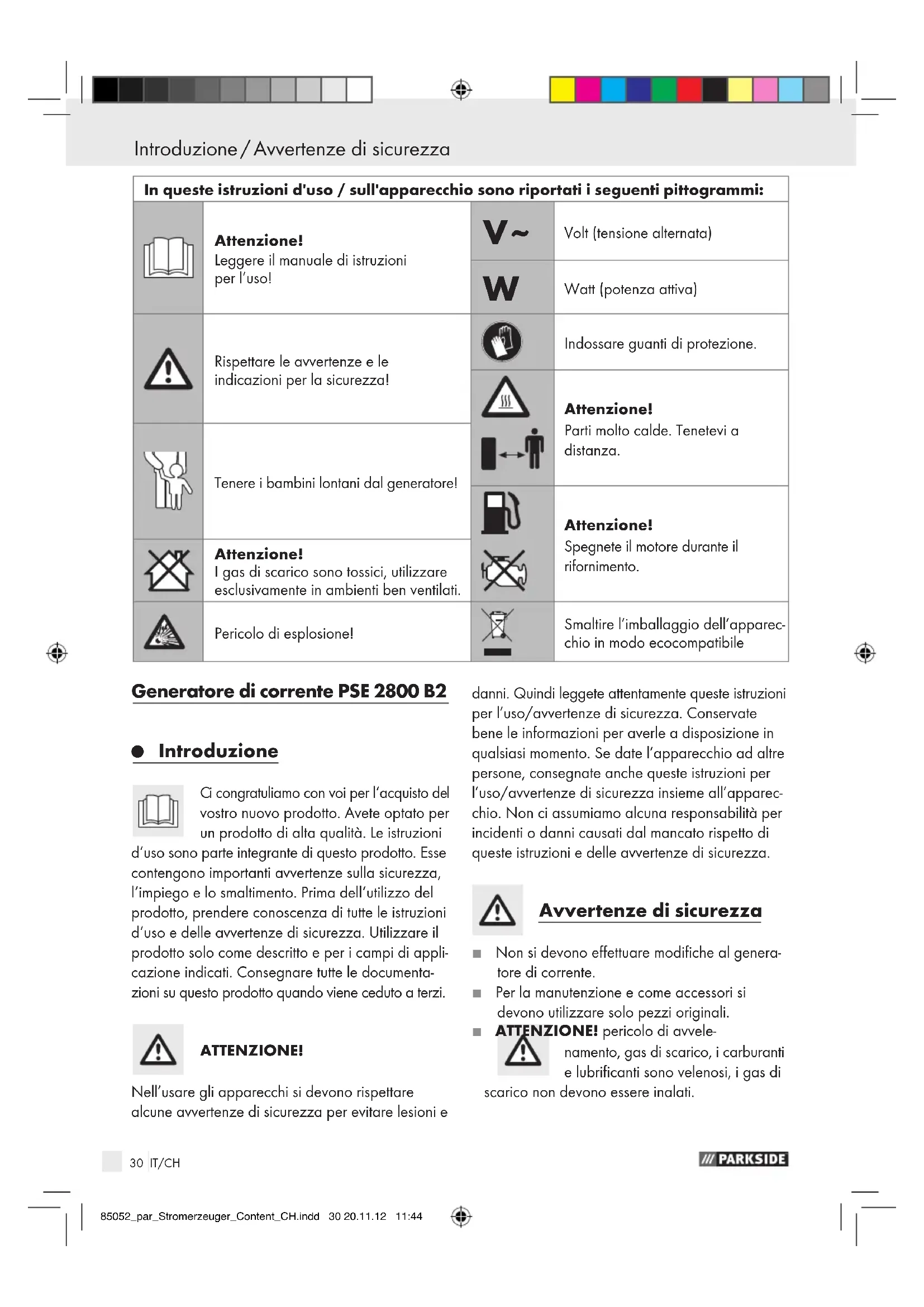 vostro nuovo prodotto. Avete optato per un prodotto di alta qualità. Le istruzioni d‘uso sono parte integrante di questo prodotto. Esse contengono importanti avvertenze sulla sicurezza, l‘impiego e lo smaltimento. Prima dell‘utilizzo del prodotto, prendere conoscenza di tutte le istruzioni d‘uso e delle avvertenze di sicurezza. Utilizzare il prodotto solo come descritto e per i campi di appli- cazione indicati. Consegnare tutte le documenta- zioni su questo prodotto quando viene ceduto a terzi. ATTENZIONE! Nell’usare gli apparecchi si devono rispettare alcune avvertenze di sicurezza per evitare lesioni e danni. Quindi leggete attentamente queste istruzioni per l’uso/avvertenze di sicurezza. Conservate bene le informazioni per averle a disposizione in qualsiasi momento. Se date l’apparecchio ad altre persone, consegnate anche queste istruzioni per l’uso/avvertenze di sicurezza insieme all’apparec- chio. Non ci assumiamo alcuna responsabilità per incidenti o danni causati dal mancato rispetto di queste istruzioni e delle avvertenze di sicurezza. Avvertenze di sicurezza J Non si devono effettuare modifiche al genera- tore di corrente. J Per la manutenzione e come accessori si devono utilizzare solo pezzi originali. J ATTENZIONE! pericolo di avvele- namento, gas di scarico, i carburanti e lubrificanti sono velenosi, i gas di scarico non devono essere inalati. In queste istruzioni d'uso / sull'apparecchio sono riportati i seguenti pittogrammi: Attenzione! Leggere il manuale di istruzioni per l’uso!