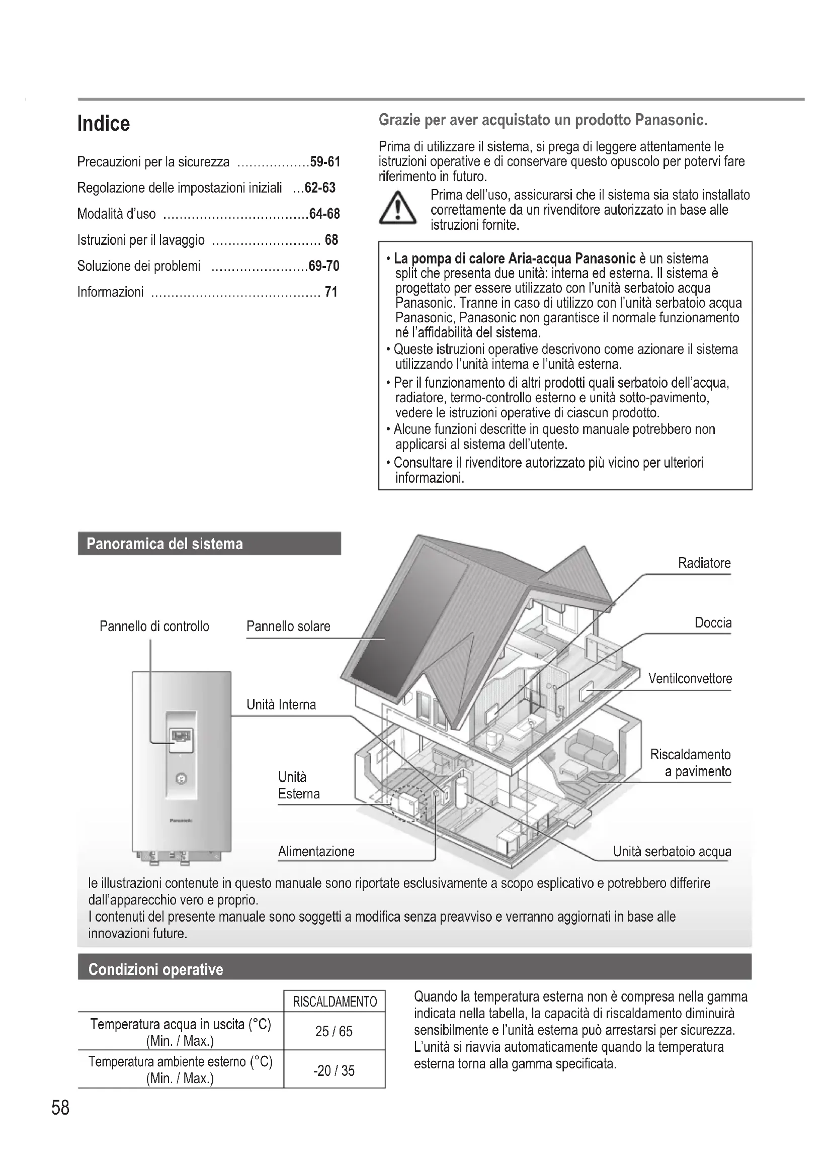 - La pompa di calore Aria-acqua Panasonic è unsystema split che presenta due unità: interna ed esterna. Il systeme è progettato per essere utilizzato con l'unità serbatoio acqua Panasonic. Tranne in caso di utilizzo con l'unità serbatoio acqua Panasonic, Panasonic non garantisce il normale funzionamento ne l'affidabilità del systema.