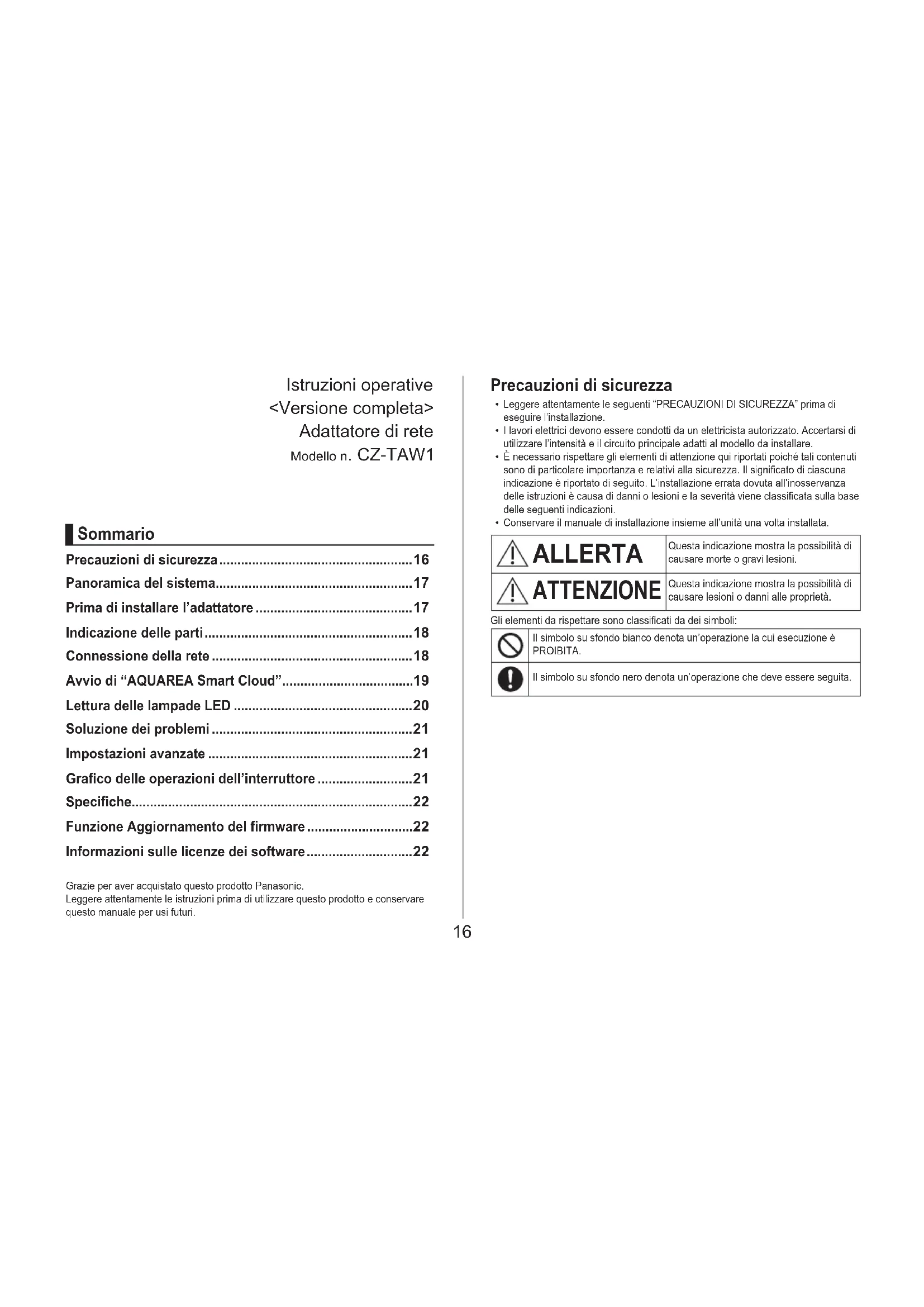 Istruzioni operative <Versione completa> Adattatore di rete Modello n. CZ‑TAW1 Grazie per aver acquistato questo prodotto Panasonic. Leggere attentamente le istruzioni prima di utilizzare questo prodotto e conservare questo manuale per usi futuri.17 ALLERTA