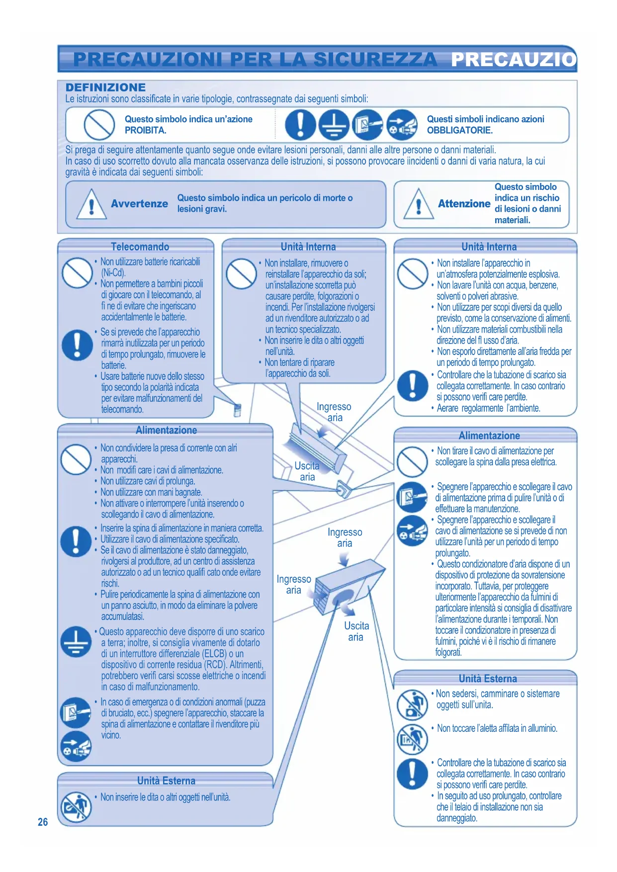 NOTE: • Il presente apparecchio è capace di funzionare come raffreddamento con temperatura esterna di -15°C in un ambiente non abitato frequentemente, per esempio la stanza del computer, con temperatura ambiente oltre 16°C ed una umidità superiore ad 80%. Quando la temperatura esterna raggiunge i -15°C, il compressore viene spento e riprende a funzionare quando la temperatura supera di nuovo i -15°C.