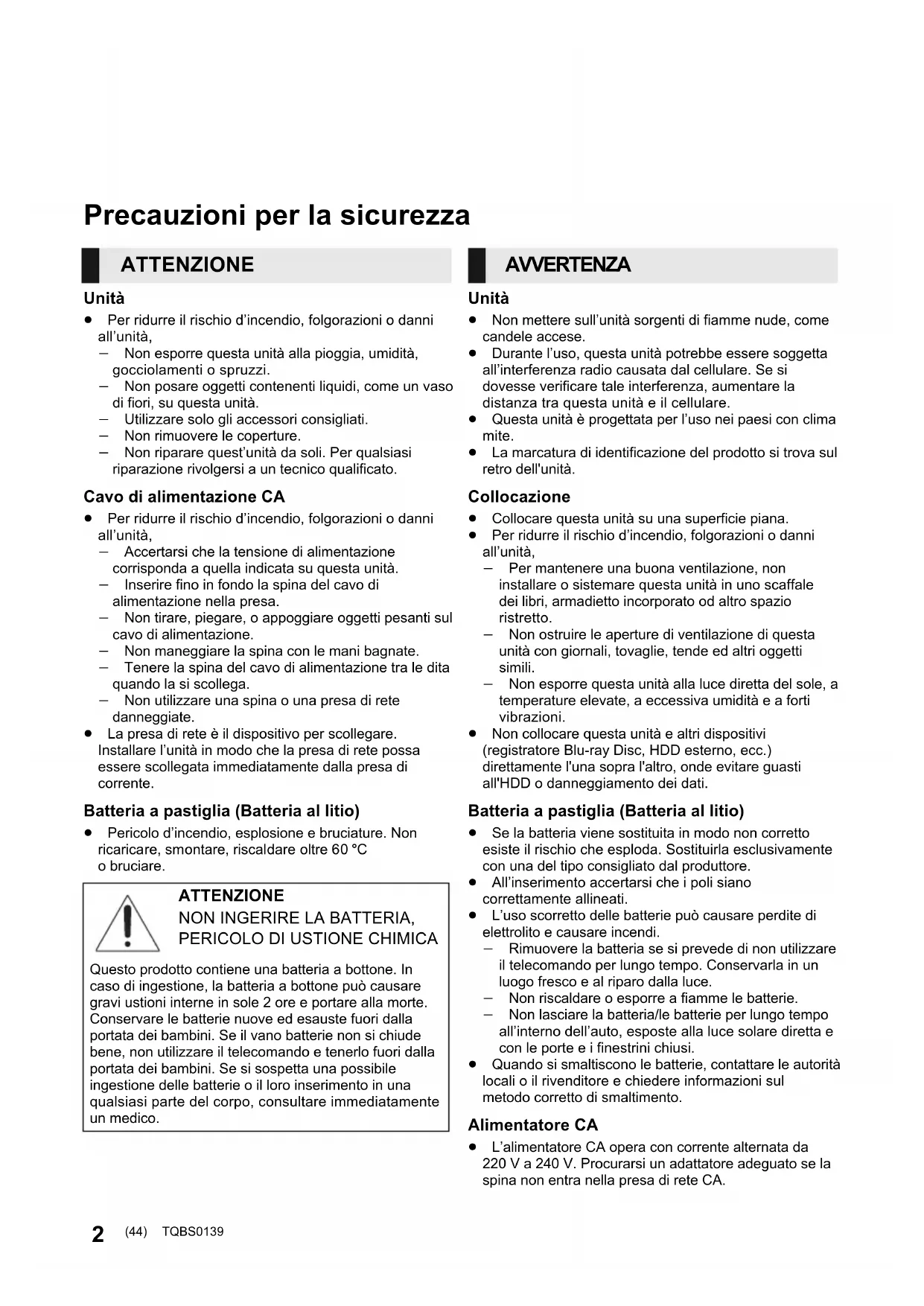 Questo prodotto contiene una batteria a bottone. In caso di ingestione, la batteria a bottone può causare gravi ustioni interne in sole 2 ore e portare alla morte. Conservare le batterie nuove ed esauste fuori dalla portata dei bambini. Se il vano batterie non si chiude bene, non utilizzare il telecomando e tenerlo fuori dalla portata dei bambini. Se si sospetta una possibile ingestione delle batterie o il loro inserimento in una qualsiasi parte del corpo, consultare immediatamente un medico. AVVERTENZA (44) SC-SB10_EG_TQBS0139_ita.book 2 ページ 2017年4月25日 火曜日 午後3時6分Precauzioni