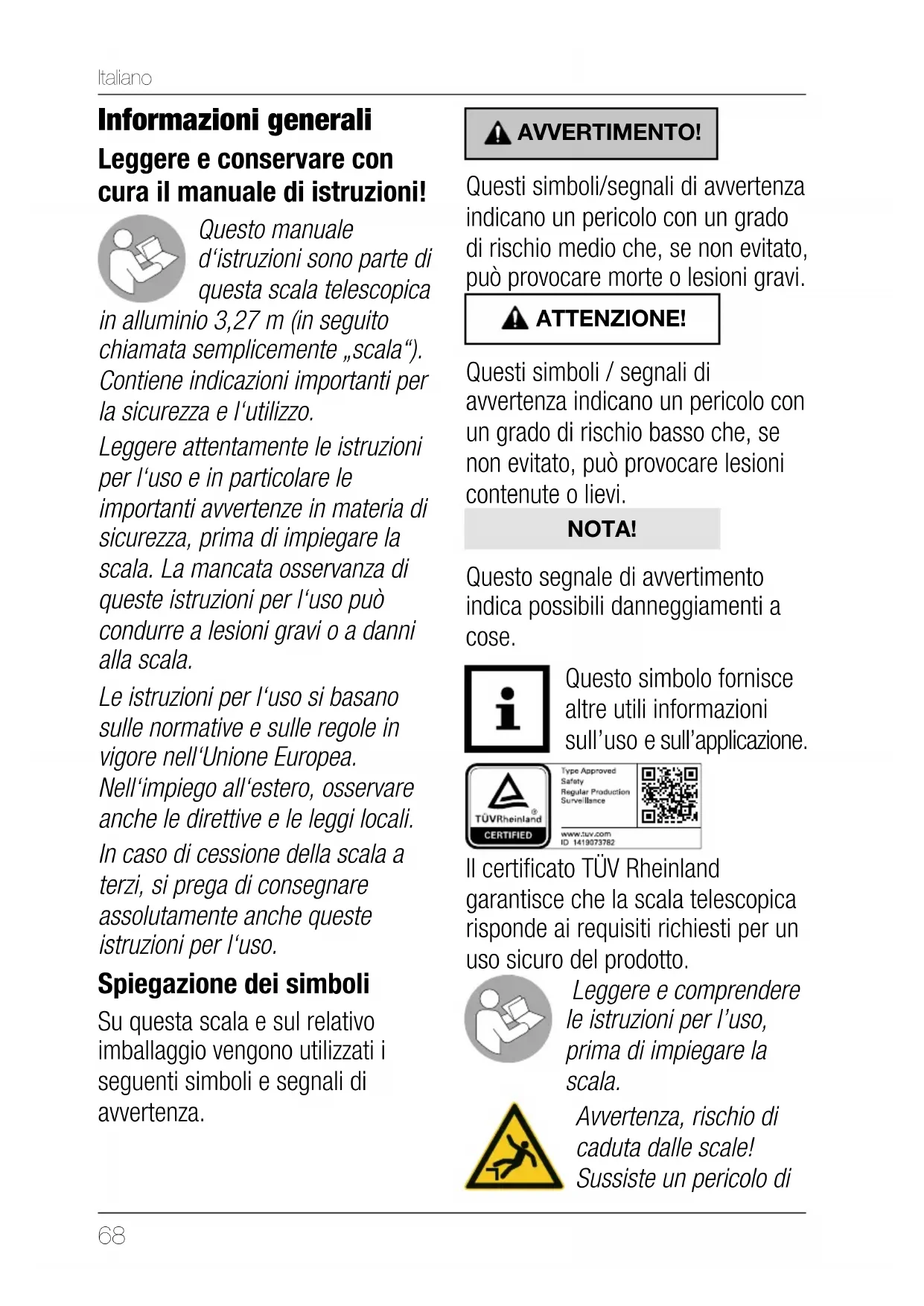 Informazioni generali Leggere e conservare con cura il manuale di istruzioni! Questo manuale d‘istruzioni sono parte di questa scala telescopica in alluminio 3,27 m (in seguito chiamata semplicemente „scala“). Contiene indicazioni importanti per la sicurezza e l‘utilizzo. Leggere attentamente le istruzioni per l‘uso e in particolare le importanti avvertenze in materia di sicurezza, prima di impiegare la scala. La mancata osservanza di queste istruzioni per l‘uso può condurre a lesioni gravi o a danni alla scala. Le istruzioni per l‘uso si basano sulle normative e sulle regole in vigore nell‘Unione Europea. Nell‘impiego all‘estero, osservare anche le direttive e le leggi locali. In caso di cessione della scala a terzi, si prega di consegnare assolutamente anche queste istruzioni per l‘uso. Spiegazione dei simboli Su questa scala e sul relativo imballaggio vengono utilizzati i seguenti simboli e segnali di avvertenza. AVVERTIMENTO! Questi simboli/segnali di avvertenza indicano un pericolo con un grado di rischio medio che, se non evitato, può provocare morte o lesioni gravi. ATTENZIONE! Questi simboli / segnali di avvertenza indicano un pericolo con un grado di rischio basso che, se non evitato, può provocare lesioni contenute o lievi. NOTA! Questo segnale di avvertimento indica possibili danneggiamenti a cose. Questo simbolo fornisce altre utili informazioni sull’uso e sull’applicazione. Il certicato TÜV Rheinland garantisce che la scala telescopica risponde ai requisiti richiesti per un uso sicuro del prodotto. Leggere e comprendere le istruzioni per l’uso, prima di impiegare la scala. Avvertenza, rischio di caduta dalle scale! Sussiste un pericolo di69 Italiano lesioni in caso di utilizzo errato. Si potrebbe scivolare facilmente o cadere dalla scala e lesionarsi. FRONT BACK Collocare la scala con il retro „back“ rivolto verso la parete e il davanti „front“ rivolto verso l‘utente. 65-75° Nel posizionare la scala, osservare il corretto angolo d’inclinazione. L’angolo d’inclinazione / angolazione di posizionamento della scala deve essere di 75° (rapporto 1:4). max.