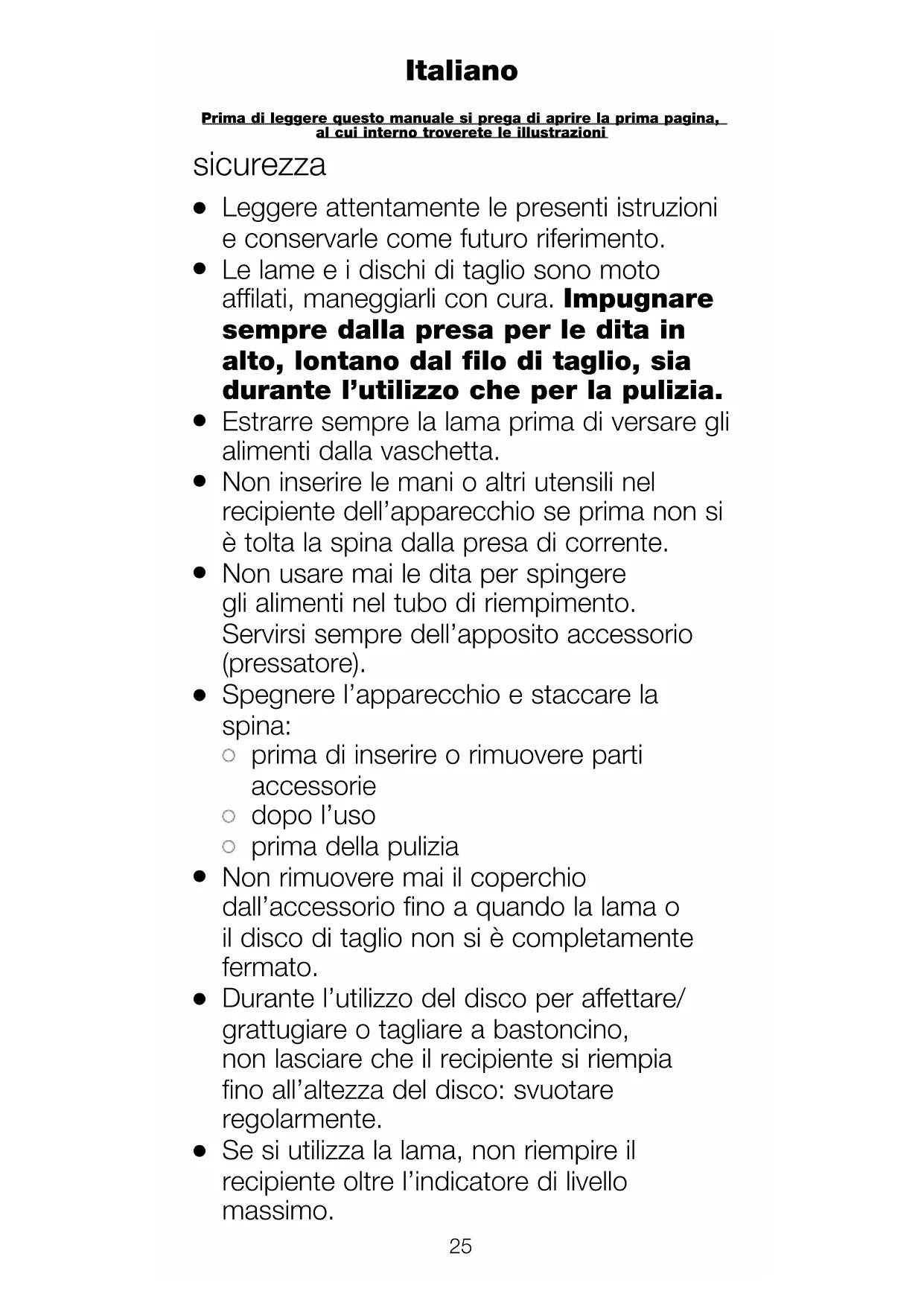 Non inserire le mani o altri utensili nel recipiente dell’apparecchio se prima non si è tolta la spina dalla presa di corrente.