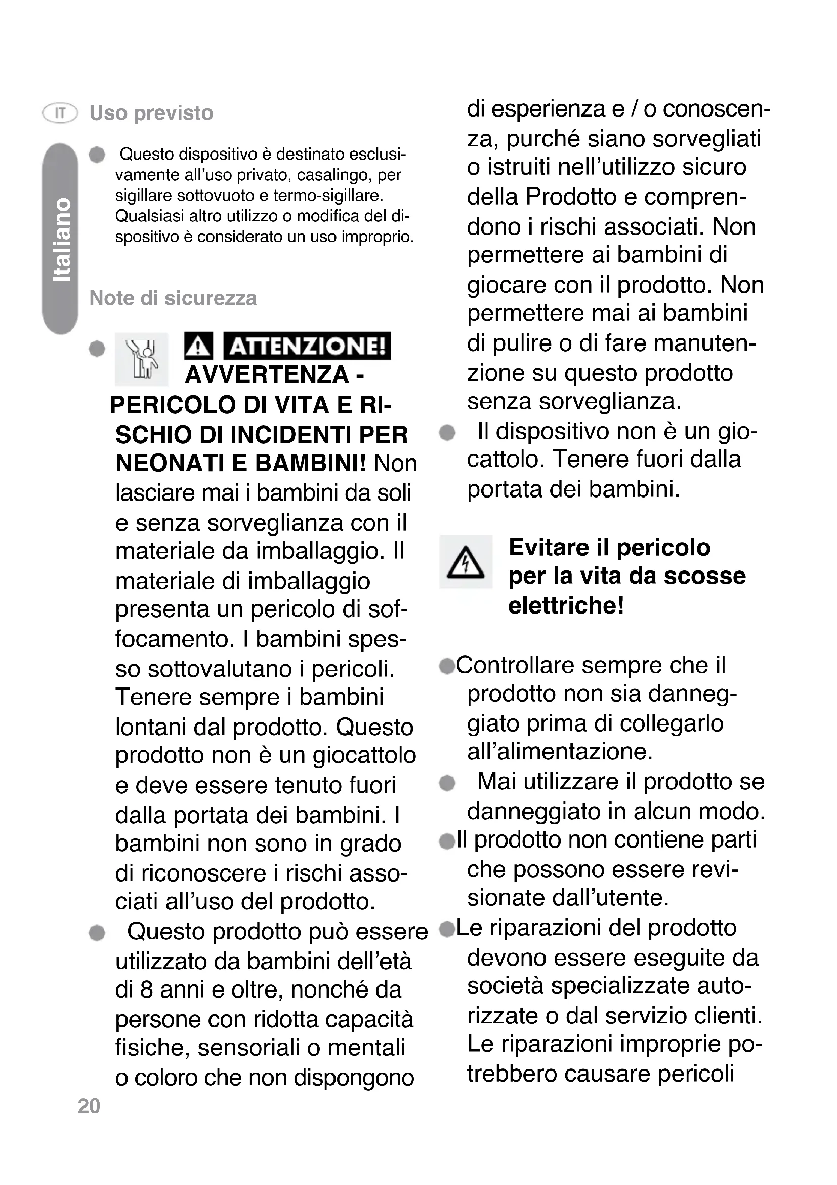 - Questo disposativo è destinato esclusivamente all'uso privato, casalingo, per sigillare sottovuoto e termo-sigillare.