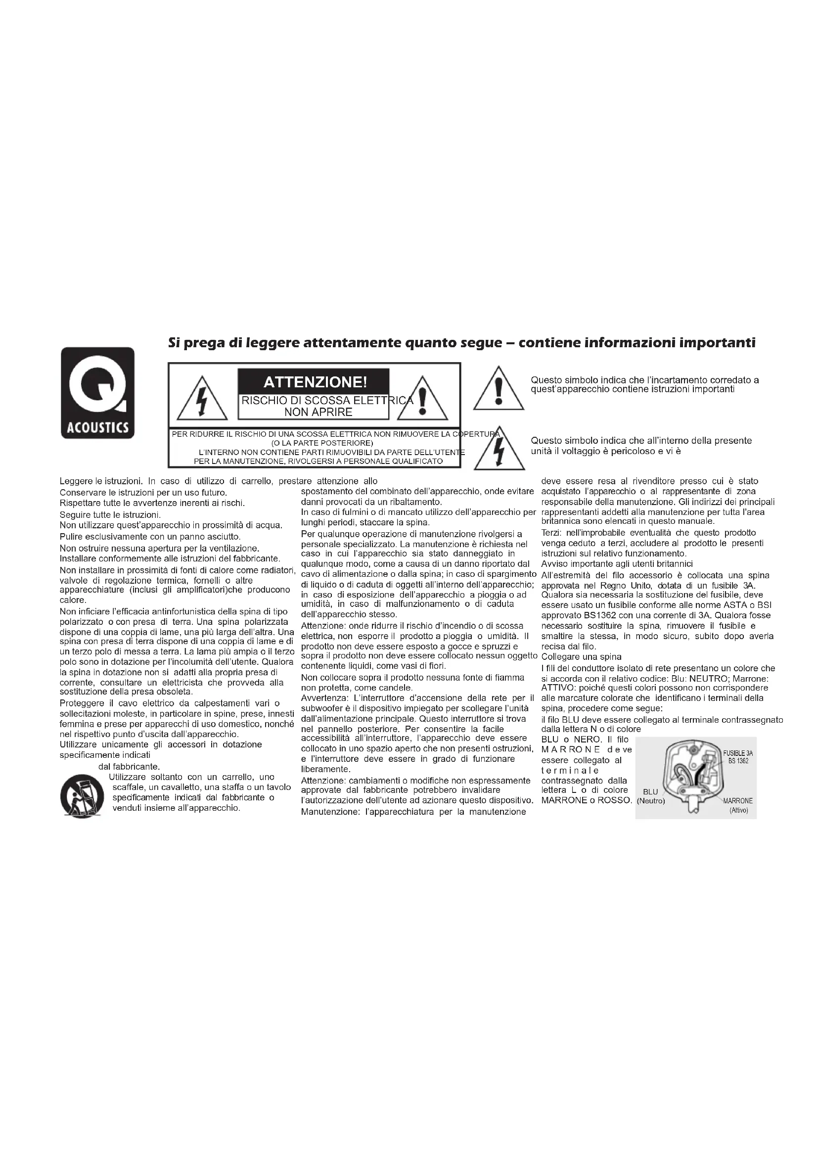 Serie 2000iLeggere le istruzioni. In caso di utilizzo di carrello, prestare attenzione allo deve essere resa al rivenditore presso cui è stato spostamento del combinato dell’apparecchio, onde evitare acquistato l’apparecchio o al rappresentante di zona Conservare le istruzioni per un uso futuro. danni provocati da un ribaltamento. responsabile della manutenzione. Gli indirizzi dei principali Rispettare tutte le avvertenze inerenti ai rischi. rappresentanti addetti alla manutenzione per tutta l’area In caso di fulmini o di mancato utilizzo dell’apparecchio per Seguire tutte le istruzioni. britannica sono elencati in questo manuale. lunghi periodi, staccare la spina. Non utilizzare quest’apparecchio in prossimità di acqua. Terzi: nell’improbabile eventualità che questo prodotto Per qualunque operazione di manutenzione rivolgersi a Pulire esclusivamente con un panno asciutto. venga ceduto a terzi, accludere al prodotto le presenti personale specializzato. La manutenzione è richiesta nel Non ostruire nessuna apertura per la ventilazione. istruzioni sul relativo funzionamento. caso in cui l’apparecchio sia stato danneggiato in Installare conformemente alle istruzioni del fabbricante. qualunque modo, come a causa di un danno riportato dal Avviso importante agli utenti britannici Non installare in prossimità di fonti di calore come radiatori, cavo di alimentazione o dalla spina; in caso di spargimento All’estremità del filo accessorio è collocata una spina valvole di regolazione termica, fornelli o altre di liquido o di caduta di oggetti all’interno dell’apparecchio; approvata nel Regno Unito, dotata di un fusibile 3A. apparecchiature (inclusi gli amplificatori)che producono in caso di esposizione dell’apparecchio a pioggia o ad Qualora sia necessaria la sostituzione del fusibile, deve calore. umidità, in caso di malfunzionamento o di caduta essere usato un fusibile conforme alle norme ASTA o BSI Non inficiare l’efficacia antinfortunistica della spina di tipo dell’apparecchio stesso. approvato BS1362 con una corrente di 3A. Qualora fosse polarizzato o con presa di terra. Una spina polarizzata Attenzione: onde ridurre il rischio d’incendio o di scossa necessario sostituire la spina, rimuovere il fusibile e dispone di una coppia di lame, una più larga dell’altra. Una elettrica, non esporre il prodotto a pioggia o umidità. Il smaltire la stessa, in modo sicuro, subito dopo averla spina con presa di terra dispone di una coppia di lame e di prodotto non deve essere esposto a gocce e spruzzi e recisa dal filo. un terzo polo di messa a terra. La lama più ampia o il terzo sopra il prodotto non deve essere collocato nessun oggetto Collegare una spina polo sono in dotazione per l’incolumità dell’utente. Qualora contenente liquidi, come vasi di fiori. I fili del conduttore isolato di rete presentano un colore che la spina in dotazione non si adatti alla propria presa di Non collocare sopra il prodotto nessuna fonte di fiamma si accorda con il relativo codice: Blu: NEUTRO; Marrone: corrente, consultare un elettricista che provveda alla non protetta, come candele. ATTIVO: poiché questi colori possono non corrispondere sostituzione della presa obsoleta. Avvertenza: L’interruttore d’accensione della rete per il alle marcature colorate che identificano i terminali della Proteggere il cavo elettrico da calpestamenti vari o subwoofer è il dispositivo impiegato per scollegare l’unità spina, procedere come segue: sollecitazioni moleste, in particolare in spine, prese, innesti dall’alimentazione principale. Questo interruttore si trova il filo BLU deve essere collegato al terminale contrassegnato femmina e prese per apparecchi di uso domestico, nonché nel pannello posteriore. Per consentire la facile dalla lettera N o di colore nel rispettivo punto d’uscita dall’apparecchio. accessibilità all’interruttore, l’apparecchio deve essere BLU o NERO. Il filo Utilizzare unicamente gli accessori in dotazione collocato in uno spazio aperto che non presenti ostruzioni, M A R RO N E d e ve specificamente indicati e l’interruttore deve essere in grado di funzionare essere collegato al dal fabbricante. liberamente. t e r m i n a l e Utilizzare soltanto con un carrello, uno Attenzione: cambiamenti o modifiche non espressamente contrassegnato dalla scaffale, un cavalletto, una staffa o un tavolo approvate dal fabbricante potrebbero invalidare lettera L o di colore specificamente indicati dal fabbricante o l’autorizzazione dell’utente ad azionare questo dispositivo. MARRONE o ROSSO. venduti insieme all’apparecchio. Manutenzione: l’apparecchiatura per la manutenzione Questo simbolo indica che l’incartamento corredato a quest’apparecchio contiene istruzioni importanti Questo simbolo indica che all’interno della presente unità il voltaggio è pericoloso e vi è Si prega di leggere attentamente quanto segue – contiene informazioni importanti ATTENZIONE!