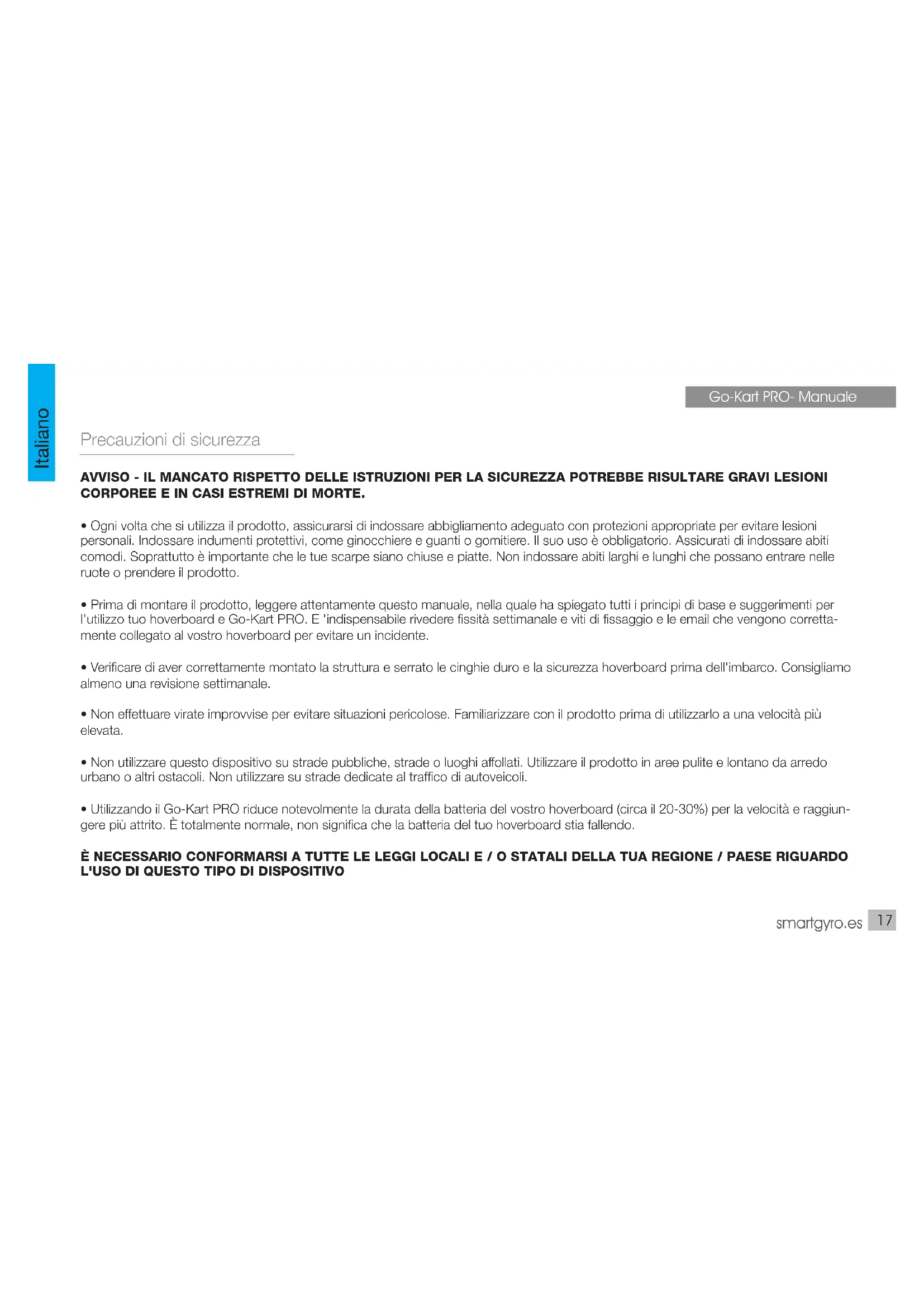 Importante L'uso del Go-Kart PRO riduce considerevolmente il tempo di batteria del tuo hoverboard (approssimativamente tra il 20-30%) dalla velocità che raggiunge e il suo maggiore attrito. È totalmente normale, non significa che la batteria del tuo hoverboard stia fallendo. Se hai utilizzato il pattino con Go-kart PRO o qualsiasi altro supporto simile, la durata della batteria è più breve perché sottopone il pattino a una velocità molto più elevata e continua. Tieni presente che con questo tipo di supporti, lo skate si surriscalda, quindi è necessario attendere fino a quando la temperatura si abbassa per ricaricarlo. Ricicla il tuo dispositivo I prodotti elettrici o elettronici, batterie, accumulatori e altri accessori devono necessariamente essere raccolti separatamente. Una volta terminata la vita utile del dispositivo elettrico o elettronico, rimuovere le batterie e deposi- tarle, separatamente, nel contenitore corretto per la corretta gestione. Tenere presente che le batterie non possono essere depositate indiscriminatamente insieme ai rifiuti domestici. Considerare il riciclaggio secondo le linee guida del produttore. Con questo gesto, contribuirà a ridurre i rischi per la salute e preservare l'ambiente. In caso di domande, rivolgersi al proprio comune o distributore per richiedere i dettagli essenziali relativi al riciclaggio del vecchio dispositi- vo. No. REI-RPA 1201-RD.106 / 2008. Osservazioni: - Indossare sempre un casco e protezioni di sicurezza per evitare lesioni personali in caso di cadute. - È progettato per essere utilizzato da chiunque di età compresa tra 14 anni con supervisione di un adulto. - SmartGyro non è responsabile per l'uso improprio che l'utente fa con questo prodotto. È importante seguire rigorosamente le misure di sicurezza di questo manuale. - L'unità include speciali protezioni in feltro da posizionare sulla parte metallica del Go-Kart in modo che non graffi o segni l'Hoverboard.smartgyro.es Precauções de segurança AVISO - O NÃO CUMPRIMENTO DAS INSTRUÇÕES DE SEGURANÇA PODE RESULTAR EM LESÕES CORPORAIS GRAVES E EM CASOS EXTREMOS DE MORTE.