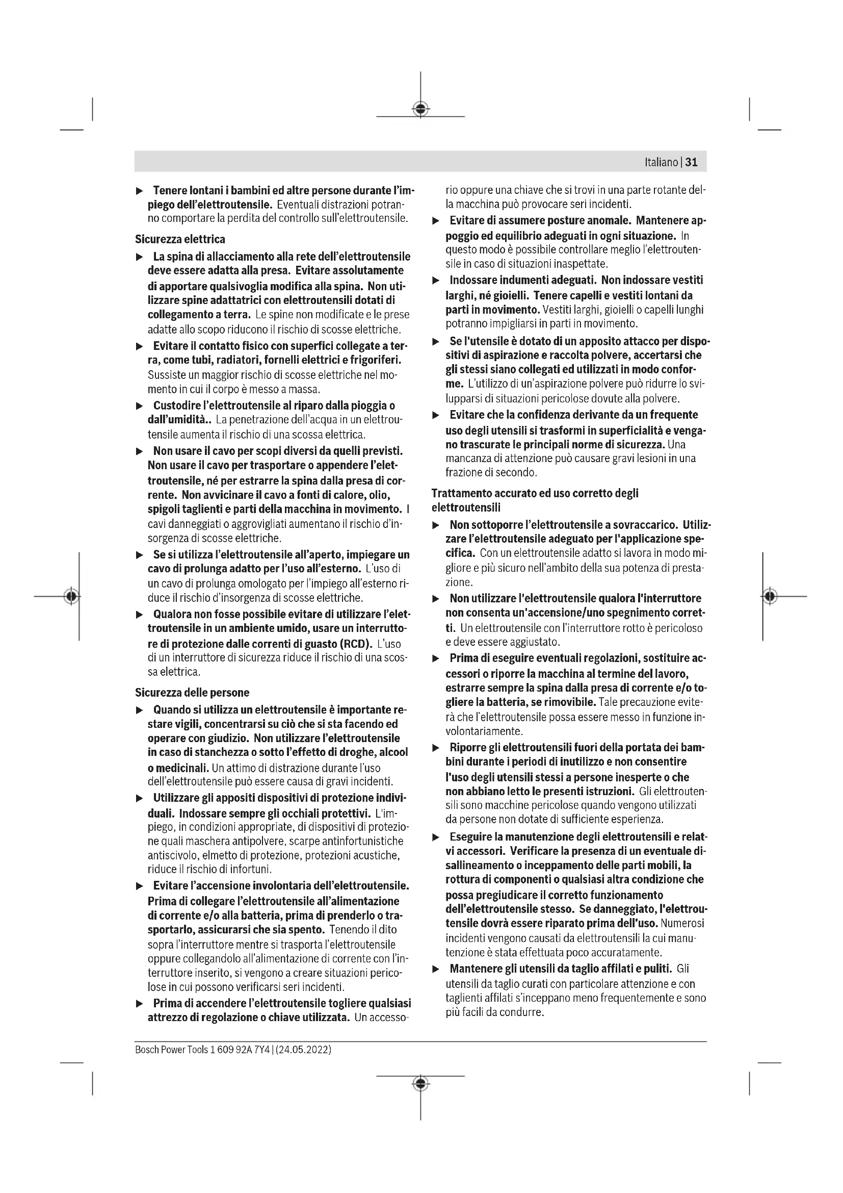 u In caso di danni o di utilizzo improprio della batteria, vi è rischio di fuoriuscita di vapori. La batteria può in- cendiarsi o esplodere. Far entrare aria fresca nell’am- biente e contattare un medico in caso di malessere. I va- pori possono irritare le vie respiratorie. u Non aprire la batteria. Vi è rischio di cortocircuito. u Qualora si utilizzino oggetti appuntiti, come ad es. chiodi o cacciaviti, oppure se si esercita forza dall’esterno, la batteria potrebbe danneggiarsi. Po- trebbe verificarsi un cortocircuito interno e la batteria po- trebbe incendiarsi, emettere fumo, esplodere o surriscal- darsi. u Utilizzare la batteria solo per prodotti del produttore. Soltanto in questo modo la batteria verrà protetta da peri- colosi sovraccarichi. Proteggere la batteria dal calore, ad esem- pio anche da irradiazione solare continua, fuoco, sporcizia, acqua ed umidità. Sussiste il pericolo di esplosioni e cortocircuito. Descrizione del prodotto e dei servizi forniti Leggere tutte le avvertenze e disposizioni di sicurezza. La mancata osservanza delle avver- tenze e disposizioni di sicurezza può causare folgorazioni, incendi e/o lesioni di grave entità. 1 609 92A 7Y4 | (24.05.2022) Bosch Power ToolsItaliano | 33 Si prega di osservare le immagini nella prima parte delle istruzioni per l’uso. Utilizzo conforme L’elettroutensile è concepito per il soffiaggio di sostanze non pericolose per la salute (ad es. trucioli di legno, trucioli di metallo, polvere di pietra ecc.) che si formano durante il ta- glio, la foratura o la levigatura. Utilizzando gli accessori adat- ti, è inoltre possibile liberare fori da residui. L’elettroutensile non è adatto al soffiaggio di materiali caldi, infiammabili o esplosivi. Componenti illustrati La numerazione dei componenti illustrati si riferisce all’illu- strazione dell’elettroutensile che si trova sulla pagina con la rappresentazione grafica. (1) Interruttore di avvio/arresto con selezione stadi (2) Impugnatura (3) Batteria