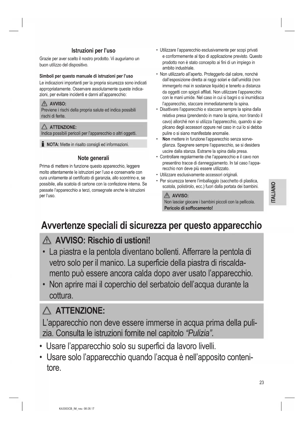 - Usare solo l’apparecchio quando l’acqua è nell’apposito conteni- tore.24 KA3003CB_IM_neu 08.08.17