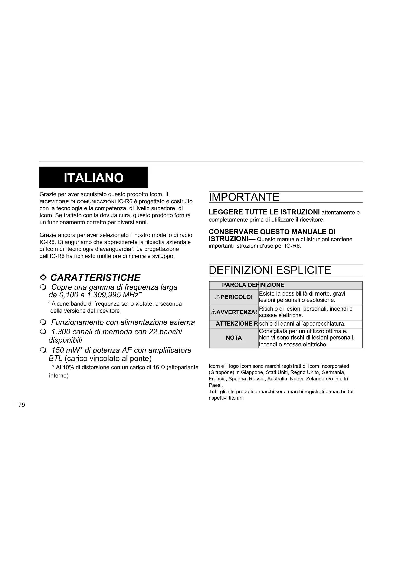 ISTRUZIONI— Questo manuale di istruzioni contiene importanti istruzioni d’uso per IC-R6. DEFINIZIONI ESPLICITE PAROLA DEFINIZIONERPERICOLO!Esiste la possibilità di morte, gravi lesioni personali o esplosione.RAVVERTENZA!Rischio di lesioni personali, incendi o scosse elettriche.ATTENZIONE Rischio di danni all’apparecchiatura. NOTA Consigliata per un utilizzo ottimale. Non vi sono rischi di lesioni personali, incendi o scosse elettriche.Icom e il logo Icom sono marchi registrati di Icom Incorporated (Giappone) in Giappone, Stati Uniti, Regno Unito, Germania, Francia, Spagna, Russia, Australia, Nuova Zelanda e/o in altri Paesi.Tutti gli altri prodotti o marchi sono marchi registrati o marchi dei rispettivi titolari. ITALIANOITALIANO