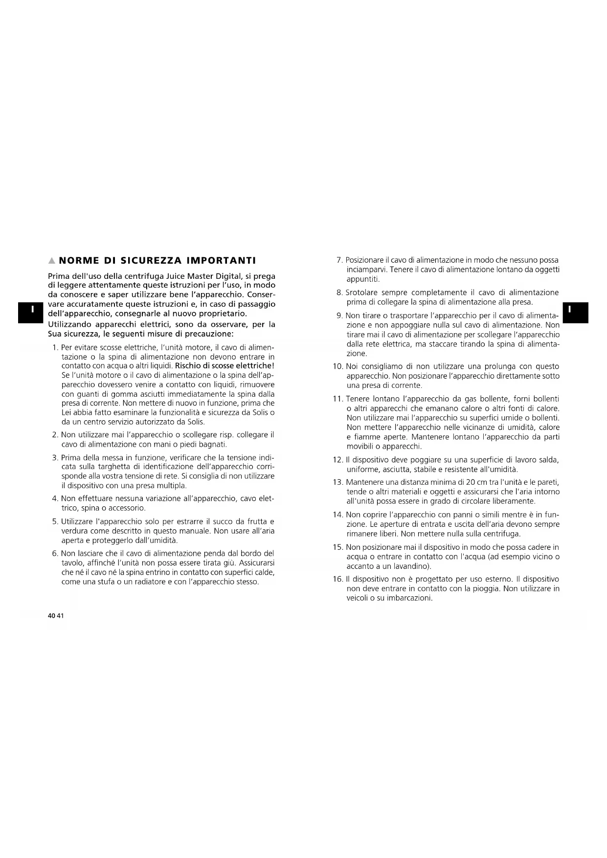 Prima dell'uso della centrifuga Juice Master Digital, si prega di leggere attentamente queste istruzioni per l’uso, in modo da conoscere e saper utilizzare bene l’apparecchio. Conser- vare accuratamente queste istruzioni e, in caso di passaggio dell’apparecchio, consegnarle al nuovo proprietario. Utilizzando apparecchi elettrici, sono da osservare, per la Sua sicurezza, le seguenti misure di precauzione: