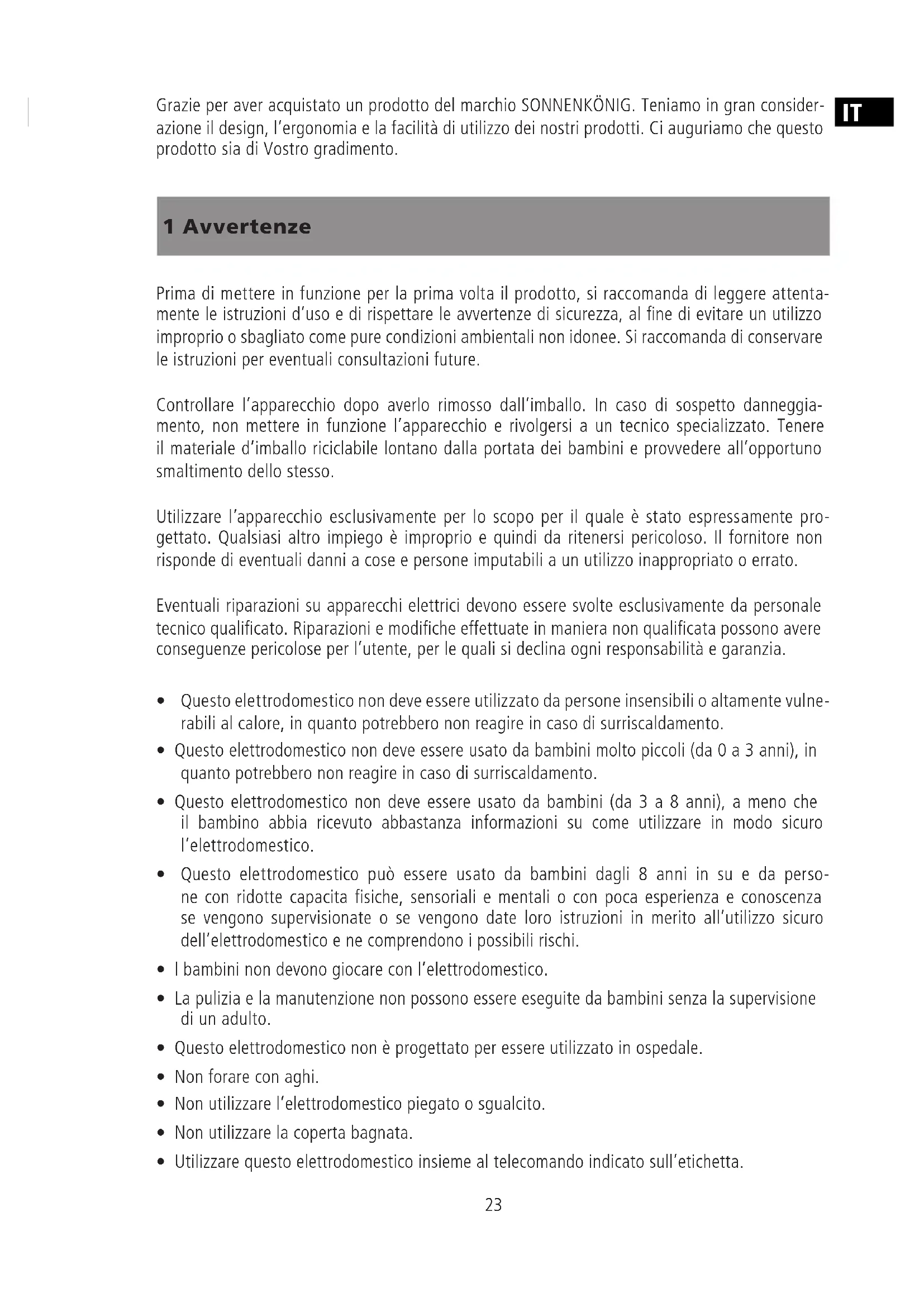- Utilizzare questo elettrodomestico insieme al telecomando indicato sull’etichetta. Grazie per aver acquistato un prodotto del marchio SONNENKÖNIG. Teniamo in gran consider- azione il design, l’ergonomia e la facilità di utilizzo dei nostri prodotti. Ci auguriamo che questo prodotto sia di Vostro gradimento. IT24