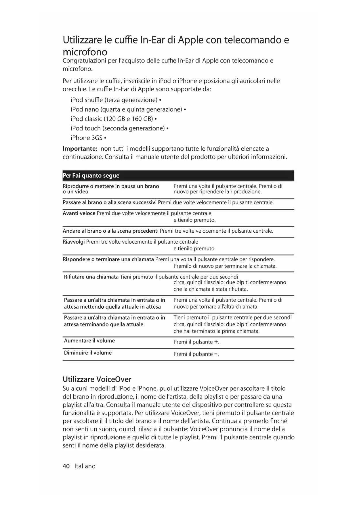 Scarica le istruzioni per il tuo Tappo per orecchio in formato PDF gratuitamente! Trova il tuo manuale InEar Headphones - APPLE e riprendi in mano il tuo dispositivo elettronico. In questa pagina sono pubblicati tutti i documenti necessari per l'utilizzo del tuo dispositivo. InEar Headphones del marchio APPLE.