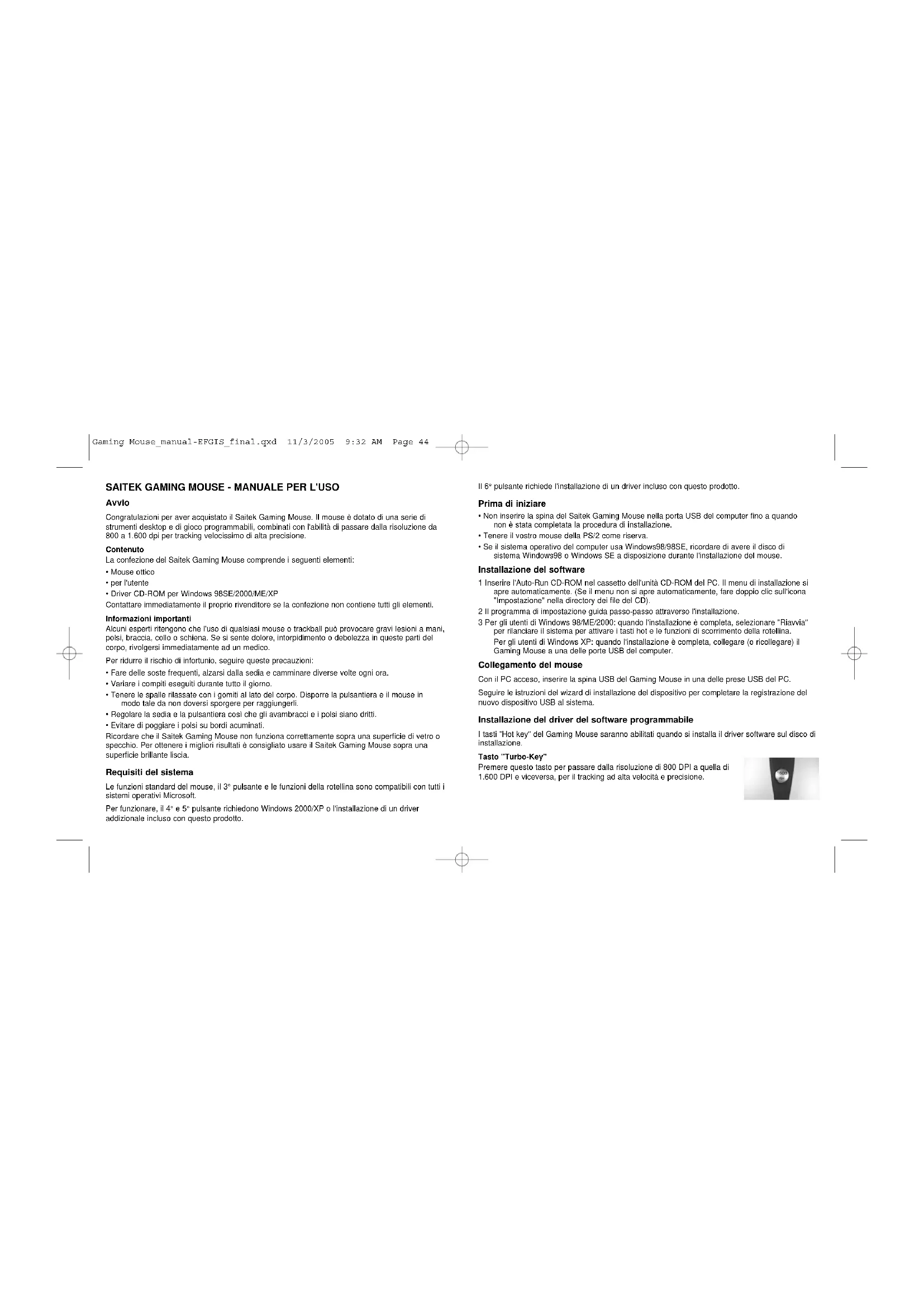 Il Saitek Gaming Mouse funziona meglio sopra superfici in rilievo per il tracking. Può non funzionare sopra superfici riflettenti, motivi riflettenti o con particolari non visibili. Mouse non rilevato Ricordare che i mouse USB sono solo supportati in Windows 98/SE, Windows ME, Windows 2000 e Windows XP. Controllare che il cavo del mouse sia inserito nella presa della corretta porta USB. Un mouse USB può essere solo collegato ad una porta USB. Controllare che la porta USB sia correttamente configurata. Consultare la documentazione del computer per verificare la corretta configurazione della porta. Possono essere presenti altri dispositivi di sistema (ad es. una scheda modem) in conflitto con il mouse. Controllare le impostazioni IRQ/dell'indirizzo di questi dispositivi per verificare la presenza di conflitti, e modificare le impostazioni secondo le esigenze. Vedete la documentazione del computer per apportare queste modifiche. Determinare se il problema è legato al mouse o al sistema, provare il mouse su un secondo sistema o provare un mouse diverso sul sistema attuale. ASSISTENZA TECNICA Avvio impossibile? Non preoccupatevi, siamo qui per aiutarti! Quasi tutti i prodotti che ci vengono resi come difettosi non sono affatto difettosi - non sono stati semplicemente installati correttamente. Se avete delle difficoltà con questo prodotto, visitate prima di tutto il nostro sito Web www.saitek.com. L'area dell'assistenza tecnica vi fornirà tutte le informazioni che vi occorrono per ottenere il meglio dal vostro prodotto e per risolvere qualsiasi problema da voi riscontrato. 53 NBpad Apre NBpad 54 Lettore CD Apre Applicazione Lettore CD Default 55 MS-Paint Apre Windows Paint 56 Indirizzario Apre Indirizzario Windows 57 Rotellina Office Apre Rotellina Applicazioni MS Windows Office, che consente di selezionare e aprire qualsiasi applicazione di MS Office 58 Rotellina-Net Apre Rotellina Internet, che consente di aprire i siti Web preferiti o effettuare ricerche Web di parole, immagini o directory 59 Rotellina-Applicazioni Apre Rotellina Applicazioni, che permette di selezionare e aprire qualsiasi applicazione programmata come selezionabile tramite la rotellina 60 Rotellina Macro Apre la Rotellina Macro, che permette di avviare qualsiasi macro programmata. 61 Doppi clic Emula la premuta dei doppi clic con il pulsante sinistro 62 Rotellina Rimani in linea La rotellina Rimani in linea permette l'effettuazione dei movimenti automatici del mouse che impedisce il timeout da alcuni siti Web a causa di mancata attività. Per arrestare questa funzione, fare clic sullo stesso pulsante configurato per usare la funzione "Rimani in linea". 63 Sistema basato sull'uso One-touch per immettere comandi per registrare e leggere. Stadio di registrazione: premere il pulsante o la rotellina una volta per iniziare la registrazione della macro per i comandi della tastiera/del mouse. Premere il pulsante o la rotellina quando la registrazione è completa. Stadio di lettura: dopo la registrazione, è possibile attivare il comando di input facendo clic sul pulsante o sulla rotellina una volta. NB: Per resettare la macro registrata, fare clic sull'icona Gaming Mouse nell'angolo destro in basso del desktop di Windows, e selezionare "Resetta Comando basato sull'uso". È possibile configurare il metodo di registrazione delle macro (comando tastiera, comando sia tastiera che mouse, ecc.): Gaming Mouse_manual-EFGIS_final.qxd 11/3/2005 9:32 AM Page 54DURATA DI QUALSIASI GARANZIA, OBBLIGO, O RESPONSABILITÀ IMPLICITI, COMPRESI MA NON LIMITATI ALLE GARANZIE IMPLICITE DI RESPONSABILITÀ E IDONEITÀ PER UNO SCOPO PARTICOLARE, SARÀ LIMITATA ALLA DURATA DELLA PRESENTE GARANZIA LIMITATA SCRITTA. Alcuni Stati non consentono limitazioni sulla durata di una garanzia implicita, perciò le suddette limitazioni possono non essere pertinenti nel vostro caso. NON SAREMO MAI RESPONSABILI PER QUALSIASI DANNO SPECIALE O CONSEGUENTE PER VIOLAZIONE DI QUESTA O DI QUALSIASI ALTRA GARANZIA, ESPLICITA O IMPLICITA, DI QUALSIASI TIPO. Alcuni Stati non consentono l'esclusione o la limitazione di danni speciali, incidentali o conseguenti, per cui la suddetta limitazione può non applicarsi nel vostro caso. La presente garanzia vi conferisce diritti legali speciali, e potete avere anche altri diritti che variano da uno Stato all'altro. Se non avete accesso all'Internet o il sito Web non è in grado di rispondere alla vostra domanda, rivolgetevi al vostro Team Assistenza Tecnica Saitek locale. Offriamo l'assistenza tecnica rapida, vasta e completa a tutti i nostri utenti. Prima di chiamarci accertatevi di avere tutte le informazioni pertinenti a portata di mano. Troverete nel foglio separato fornito con questo prodotto i dati relativi al vostro Centro di Assistenza Tecnica locale. Condizioni della garanzia 1 Il periodo di garanzia è di 2 anni dalla data d'acquisto con presentazione della prova d'acquisto. 2 Seguire le istruzioni per il funzionamento. 3 Esclude espressamente qualsiasi danno associato alla perdita delle batterie. NB: le batterie possono perdere se sono lasciate inutilizzate in un prodotto per un periodo di tempo prolungato, e per questo è consigliabile controllarle regolarmente. 4 Il prodotto non deve essere stato danneggiato a causa di deturpazione, uso errato, abuso, negligenza, incidente, distruzione o alterazione del numero di serie, incorrette tensioni o correnti elettriche, riparazione, modificazione o manutenzione effettuata da qualsiasi persona o parte eccetto dal nostro servizio di manutenzione o un centro di manutenzione autorizzato, utilizzo o installazione di parti di ricambio non Saitek nel prodotto o la modifica di questo prodotto in qualsiasi modo, o l'incorporazione di questo prodotto in qualsiasi altro prodotto, o danni al prodotto provocato da incidente, incendio, inondazione, fulmini o forza maggiore, o qualsiasi uso che contravviene alle istruzioni fornite da Saitek plc. 5 Gli obblighi di Saitek saranno limitati alla 