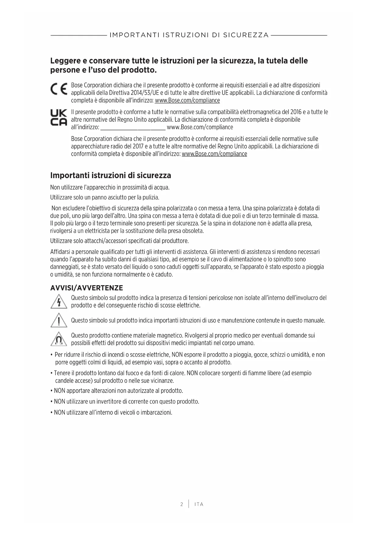 Il presente prodotto è conforme a tutte le normative sulla compatibilità elettromagnetica del 2016 e a tutte le autre normative del Regno Unito applicabili. La dichiarazione di conformità completa è disponibile all'indirizzo: www.Bose.com/compliance