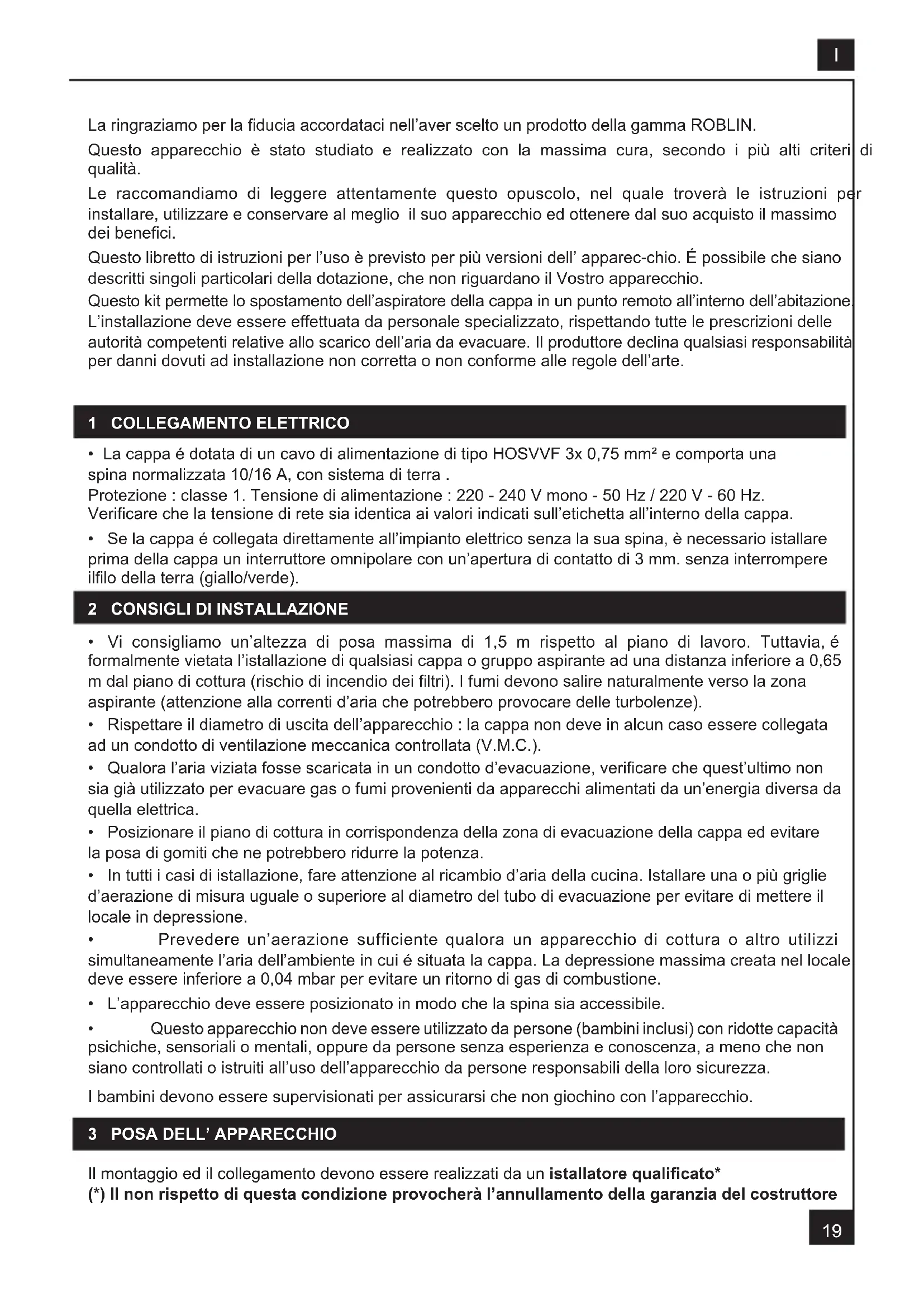 - In tutti i casi di istallazione, fare attenzione al ricambio d’aria della cucina. Istallare una o più griglie d’aerazione di misura uguale o superiore al diametro del tubo di evacuazione per evitare di mettere il locale in depressione.