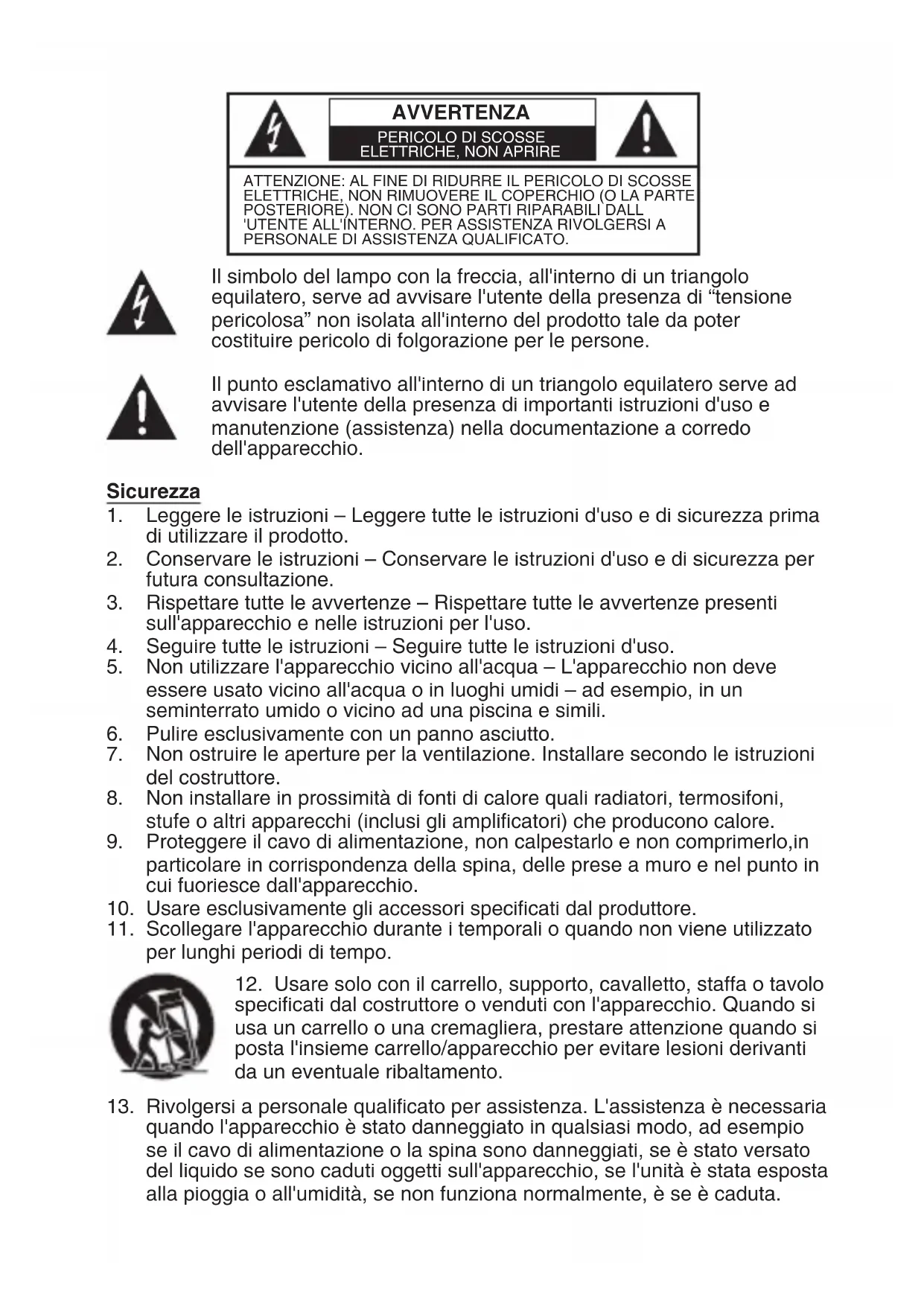 Usare solo con il carrello, supporto, cavalletto, staffa o ravolo specificati dal costruttore o venduti con l'apparecchio. Quando si usa un carrello o una cremagliera, prestare attenzione quando si posta l'insieme carrello/apparecchio per evitare lesioni derivanti da un eventuale ribaltamento.