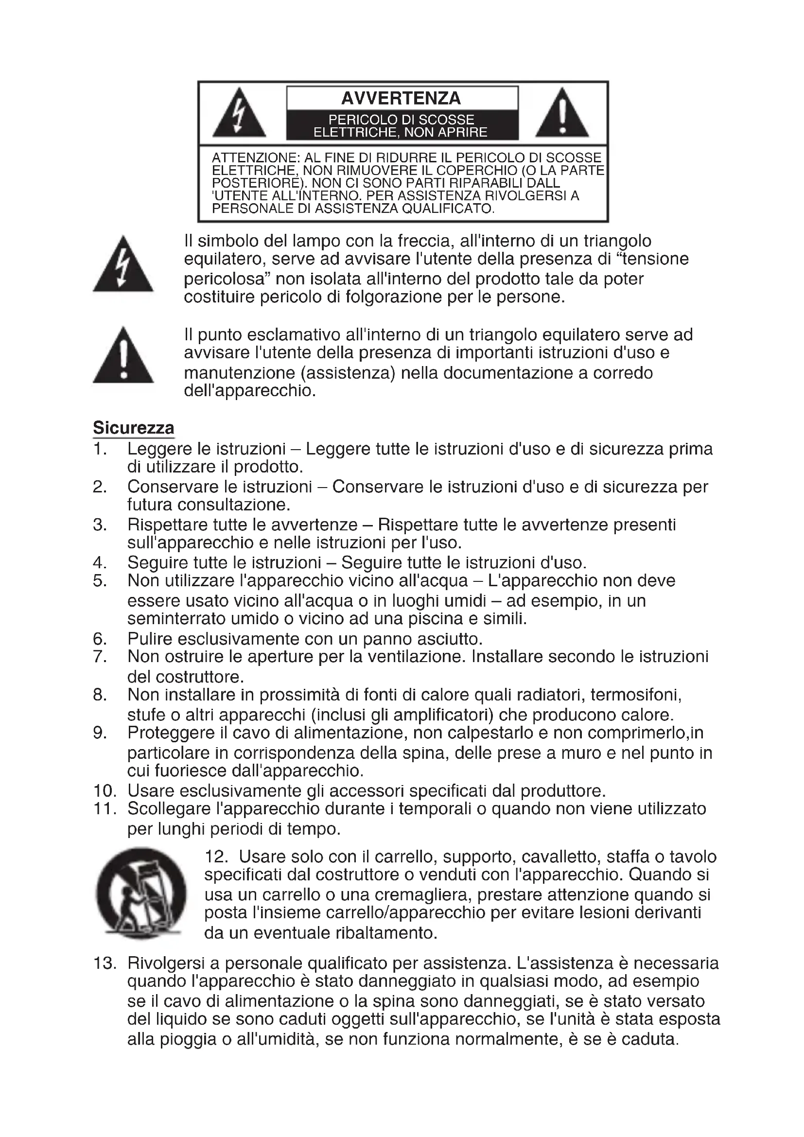 Usare solo con il carrello, supporto, cavalletto, staffa o tavolo specificati dal costruttore o venduti con l'apparecchio. Quando si usa un carrello o una cremagliera, prestare attenzione quando si posta l'insieme carrello/apparecchio per evitare lesioni derivanti da un eventuale ribaltamento.