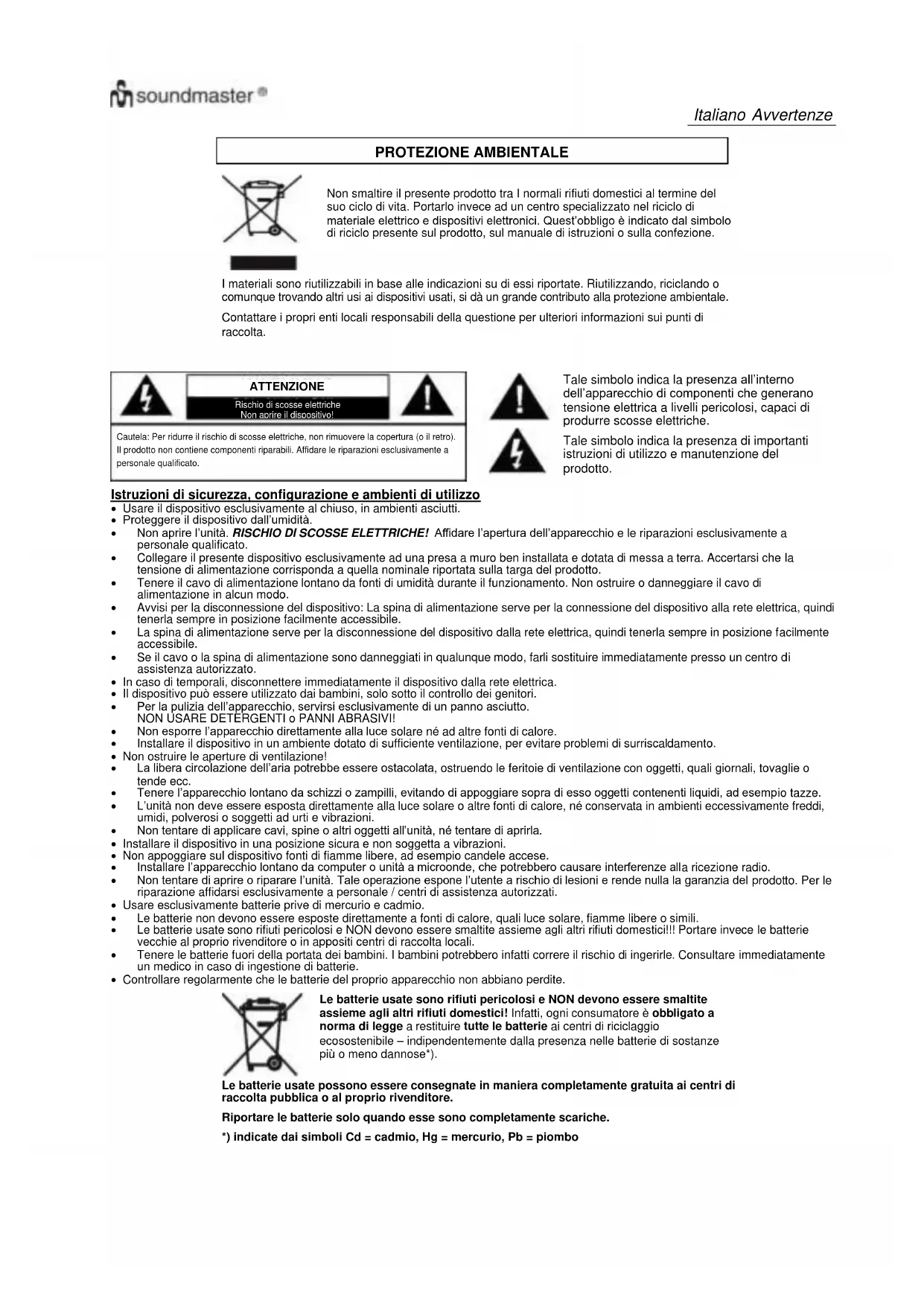 Tale simbolo indica la presenza di importanti istruzioni di utilizzo e manutenzione del prodotto. Istruzioni di sicurezza, configurazione e ambienti di utilizzo Usare il dispositivo esclusivamente al chiuso, in ambienti asciutti. Proteggere il dispositivo dall’umidità. Non aprire l’unità. RISCHIO DI SCOSSE ELETTRICHE! Affidare l’apertura dell’apparecchio e le riparazioni esclusivamente a personale qualificato. Collegare il presente dispositivo esclusivamente ad una presa a muro ben installata e dotata di messa a terra. Accertarsi che la tensione di alimentazione corrisponda a quella nominale riportata sulla targa del prodotto. Tenere il cavo di alimentazione lontano da fonti di umidità durante il funzionamento. Non ostruire o danneggiare il cavo di alimentazione in alcun modo. Avvisi per la disconnessione del dispositivo: La spina di alimentazione serve per la connessione del dispositivo alla rete elettrica, quindi tenerla sempre in posizione facilmente accessibile. La spina di alimentazione serve per la disconnessione del dispositivo dalla rete elettrica, quindi tenerla sempre in posizione facilmente accessibile. Se il cavo o la spina di alimentazione sono danneggiati in qualunque modo, farli sostituire immediatamente presso un centro di assistenza autorizzato. In caso di temporali, disconnettere immediatamente il dispositivo dalla rete elettrica. Il dispositivo può essere utilizzato dai bambini, solo sotto il controllo dei genitori. Per la pulizia dell’apparecchio, servirsi esclusivamente di un panno asciutto. NON USARE DETERGENTI o PANNI ABRASIVI! Non esporre l’apparecchio direttamente alla luce solare né ad altre fonti di calore. Installare il dispositivo in un ambiente dotato di sufficiente ventilazione, per evitare problemi di surriscaldamento. Non ostruire le aperture di ventilazione! La libera circolazione dell’aria potrebbe essere ostacolata, ostruendo le feritoie di ventilazione con oggetti, quali giornali, tovaglie o tende ecc. Tenere l’apparecchio lontano da schizzi o zampilli, evitando di appoggiare sopra di esso oggetti contenenti liquidi, ad esempio tazze. L’unità non deve essere esposta direttamente alla luce solare o altre fonti di calore, né conservata in ambienti eccessivamente freddi, umidi, polverosi o soggetti ad urti e vibrazioni. Non tentare di applicare cavi, spine o altri oggetti all’unità, né tentare di aprirla. Installare il dispositivo in una posizione sicura e non soggetta a vibrazioni. Non appoggiare sul dispositivo fonti di fiamme libere, ad esempio candele accese. Installare l’apparecchio lontano da computer o unità a microonde, che potrebbero causare interferenze alla ricezione radio. Non tentare di aprire o riparare l’unità. Tale operazione espone l’utente a rischio di lesioni e rende nulla la garanzia del prodotto. Per le riparazione affidarsi esclusivamente a personale / centri di assistenza autorizzati. Usare esclusivamente batterie prive di mercurio e cadmio. Le batterie non devono essere esposte direttamente a fonti di calore, quali luce solare, fiamme libere o simili. Le batterie usate sono rifiuti pericolosi e NON devono essere smaltite assieme agli altri rifiuti domestici!!! Portare invece le batterie vecchie al proprio rivenditore o in appositi centri di raccolta locali. Tenere le batterie fuori della portata dei bambini. I bambini potrebbero infatti correre il rischio di ingerirle. Consultare immediatamente un medico in caso di ingestione di batterie. Controllare regolarmente che le batterie del proprio apparecchio non abbiano perdite.