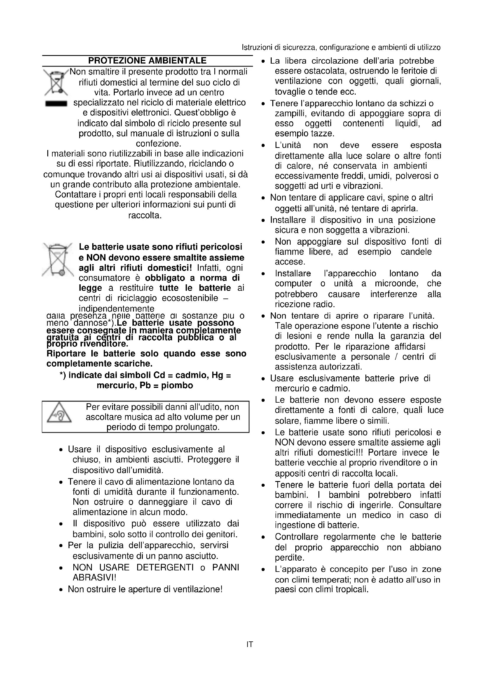 Non tentare di aprire o riparare l'unità. Tale operazione espone l'utente a rischio di lesioni e rende nulla la garanzia del prodotto. Per le riparazione affidavit si escludivamente a personale / centri di assistenza autorizzati. - Usare esclusivamente batterie prive di mercurio e cadmium.