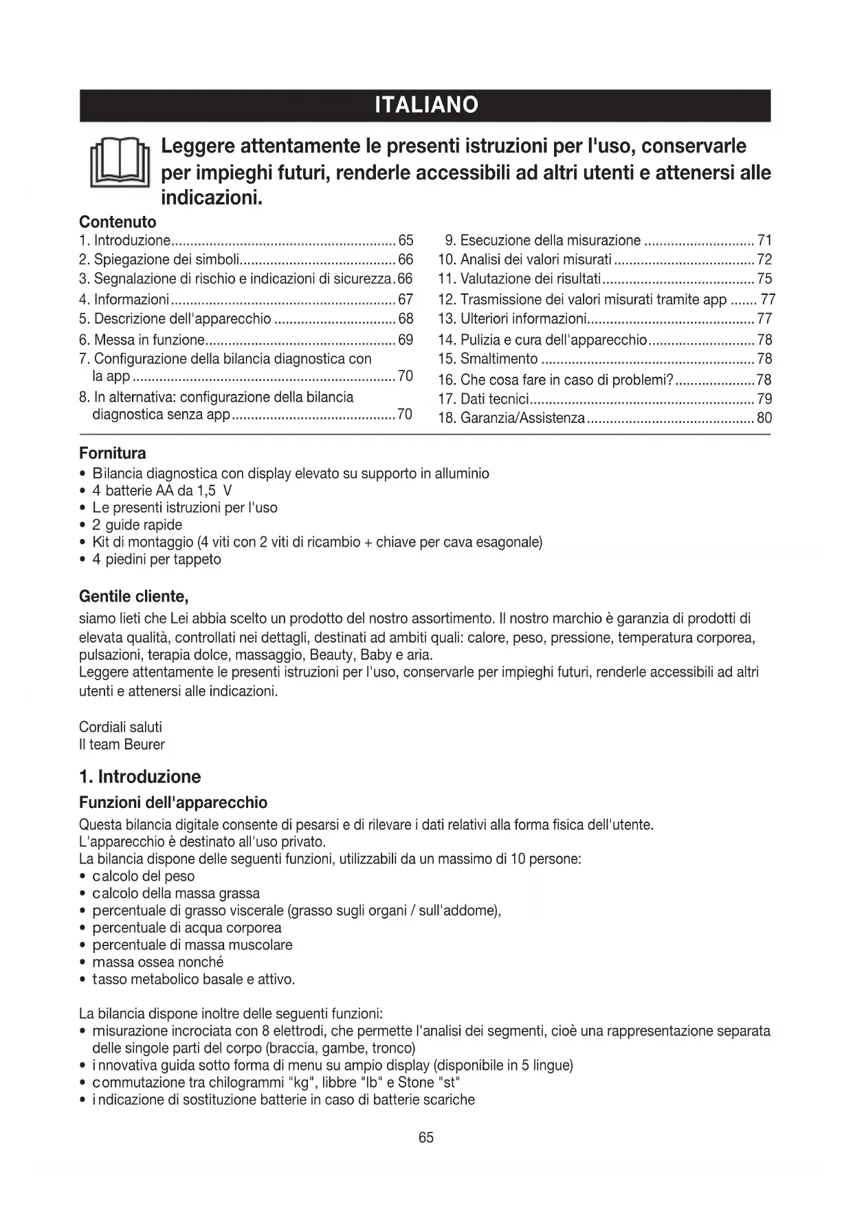 ndicazione di sostituzione batterie in caso di batterie scariche Leggere attentamente le presenti istruzioni per l'uso, conservarle per impieghi futuri, renderle accessibili ad altri utenti e attenersi alle indicazioni. Contenuto66