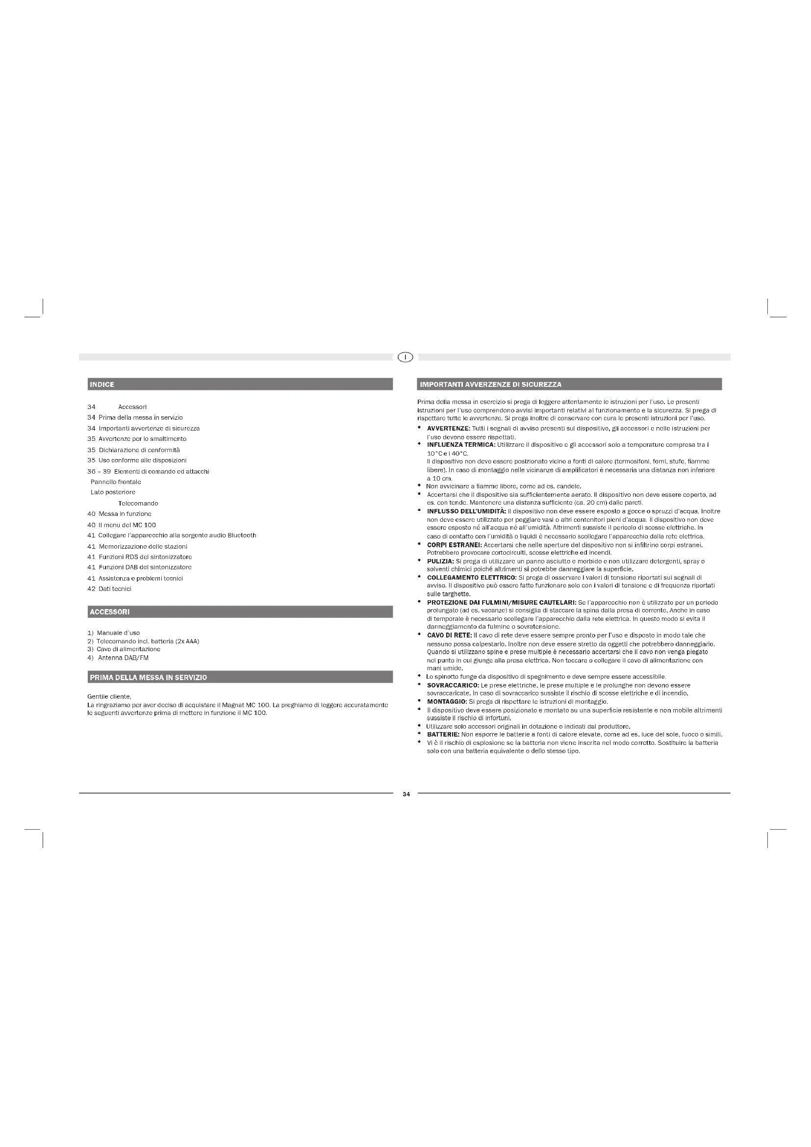 - Vi è il rischio di esplosione se la batteria non viene inserita nel modo corretto. Sostituire la batteria solo con una batteria equivalente o dello stesso tipo. INDICE 34 Accessori 34 Prima della messa in servizio 34 Importanti avvertenze di sicurezza 35 Avvertenze per lo smaltimento 35 Dichiarazione di conformità 35 Uso conforme alle disposizioni 36 – 39 Elementi di comando ed attacchi Pannello frontale Lato posteriore Telecomando 40 Messa in funzione 40 Il menu del MC 100 41 Collegare l’apparecchio alla sorgente audio Bluetooth 41 Memorizzazione delle stazioni 41 Funzioni RDS del sintonizzatore 41 Funzioni DAB del sintonizzatore 41 Assistenza e problemi tecnici 42 Dati tecnici ACCESSORI