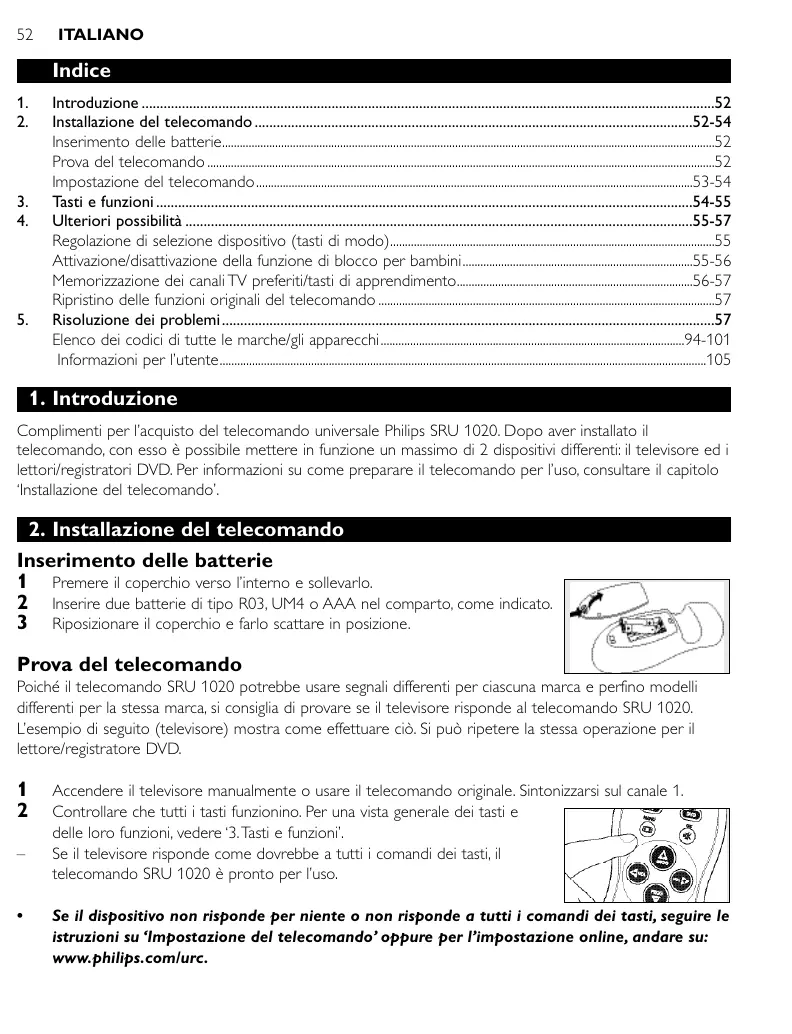 Complimenti per l’acquisto del telecomando universale Philips SRU 1020. Dopo aver installato il telecomando, con esso è possibile mettere in funzione un massimo di 2 dispositivi differenti: il televisore ed i lettori/registratori DVD. Per informazioni su come preparare il telecomando per l’uso, consultare il capitolo ‘Installazione del telecomando’.