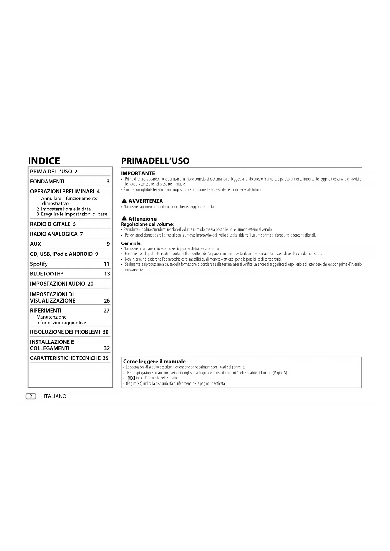 FONDAMENTI 3 OPERAZIONI PRELIMINARI 4 1 Annullare il funzionamento dimostrativo 2 Impostare l’ora e la data 3 Eseguire le impostazioni di base RADIO DIGITALE 5 RADIO ANALOGICA 7 AUX 9 CD, USB, iPod e ANDROID 9 Spotify 11 BLUETOOTH® 13 IMPOSTAZIONI AUDIO 20 IMPOSTAZIONI DI VISUALIZZAZIONE 26 RIFERIMENTI 27 Manutenzione Informazioni aggiuntive