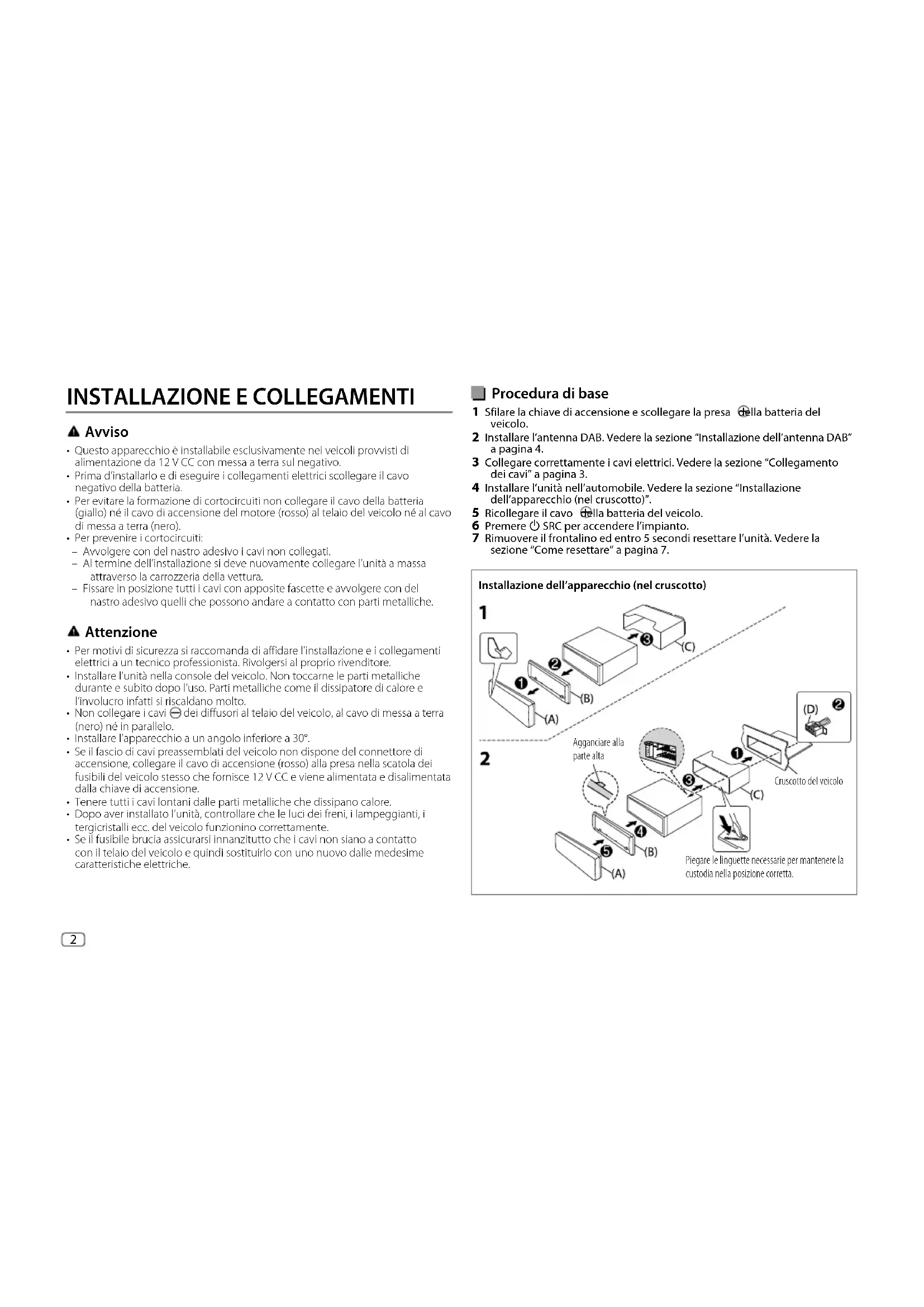 - Per prevenire i cortocircuiti: – Avvolgere con del nastro adesivo i cavi non collegati. – Al termine dell’installazione si deve nuovamente collegare l’unità a massa attraverso la carrozzeria della vettura. – Fissare in posizione tutti i cavi con apposite fascette e avvolgere con del nastro adesivo quelli che possono andare a contatto con parti metalliche. Attenzione