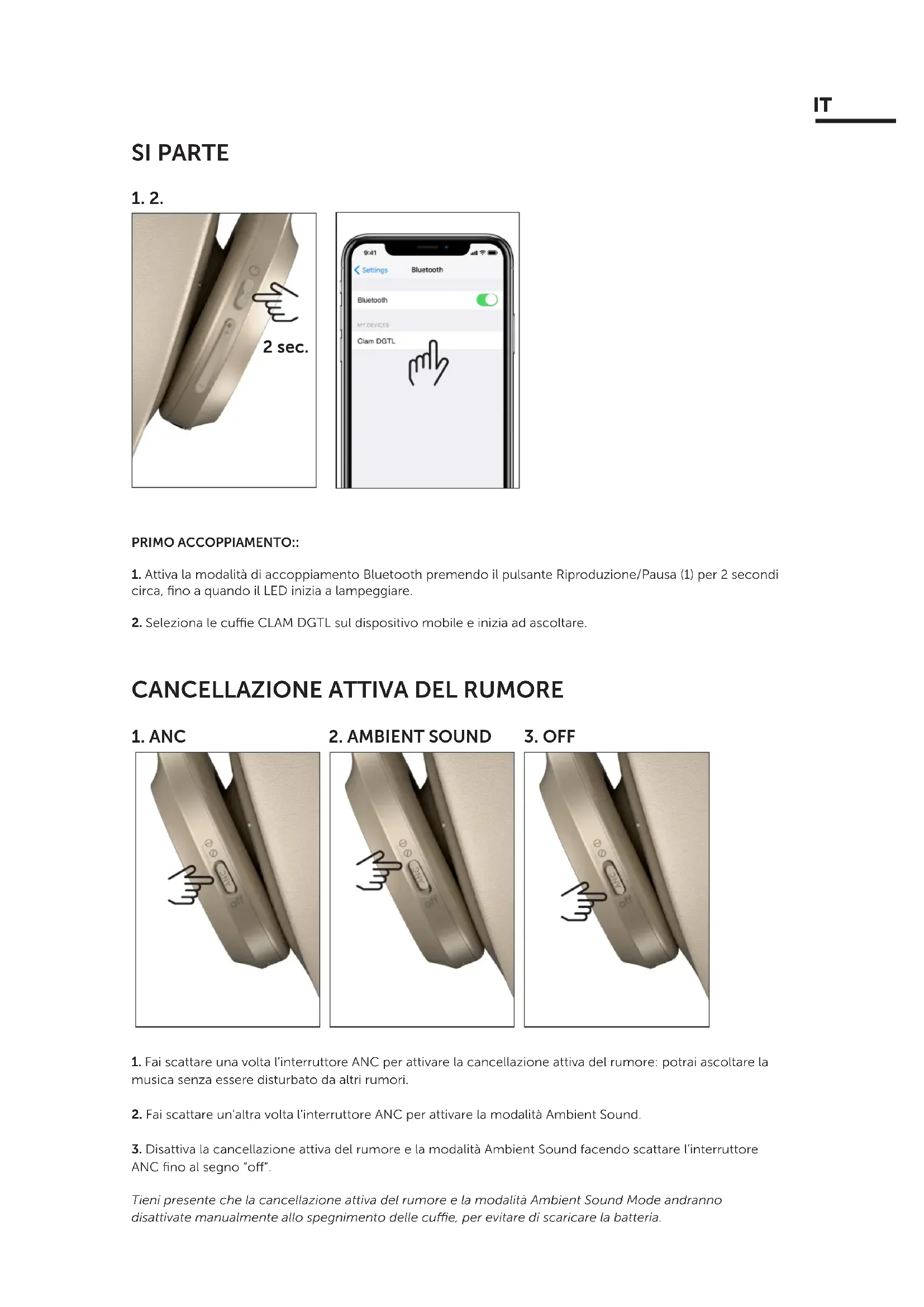 Cancellazione attiva del rumore + Modalità Ambient Sound INATTIVE Modalità Ambient Sound ATTIVA Cancellazione attiva del rumore ATTIVA PULSANTI Pulsante Riproduci/Pausa (1) PRESSIONE PER 2 SEC.: accende le cue ed esegue automaticamente l’accoppiamento con l’ultimo dispositivo PRESSIONE PER 2 SEC.: spegne le cue PRESSIONE PER 4 SEC.: se le cue sono spente, ripristina e torna alla modalità di abbinamento Bluetooth, quindi esegue l’accoppiamento con un dispositivo nuovo UN CLIC: Riproduci/Pausa DOPPIO CLIC: attiva l’Assistente vocale Pulsanti del volume (3) UN CLIC SUL PULSANTE +: Alza il volume PRESSIONE PULSANTE + 2 SEC.: Brano successivo UN CLIC SUL PULSANTE -: Abbassa il volume PRESSIONE PULSANTE - 2 SEC.: Brano precedente