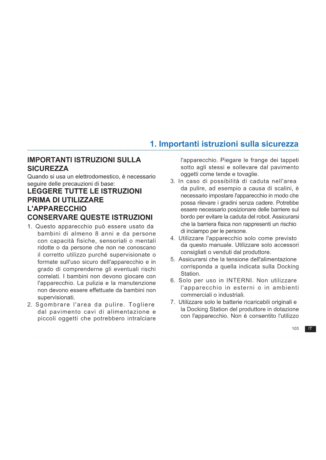 1 Questo apparecchio può essere usato da bambini di almeno 8 anni e da persone con capacità fisiche, sensoriali o mentali ridotte o da persone che non ne conoscano il corretto utilizzo purché supervisionate o formate sull'uso sicuro dell'apparecchio e in grado di comprenderne gli eventuali rischi correlati I bambini non devono giocare con l'apparecchio La pulizia e la manutenzione non devono essere effettuate da bambini non supervisionati 2 Sgombrare l'area da pulire Togliere dal pavimento cavi di alimentazione e piccoli oggetti che potrebbero intralciare l'apparecchio Piegare le frange dei tappeti sotto agli stessi e sollevare dal pavimento oggetti come tende e tovaglie 3 In caso di possibilità di caduta nell'area da pulire, ad esempio a causa di scalini, è necessario impostare l'apparecchio in modo che possa rilevare i gradini senza cadere Potrebbe essere necessario posizionare delle barriere sul bordo per evitare la caduta del robot Assicurarsi che la barriera sica non rappresenti un rischio di inciampo per le persone 4 Utilizzare l'apparecchio solo come previsto da questo manuale Utilizzare solo accessori consigliati o venduti dal produttore 5 Assicurarsi che la tensione dell'alimentazione corrisponda a quella indicata sulla Docking Station 6 Solo per uso in INTERNI Non utilizzare l'apparecchio in esterni o in ambienti commerciali o industriali 7 Utilizzare solo le batterie ricaricabili originali e la Docking Station del produttore in dotazione con l'apparecchio Non è consentito l'utilizzo
