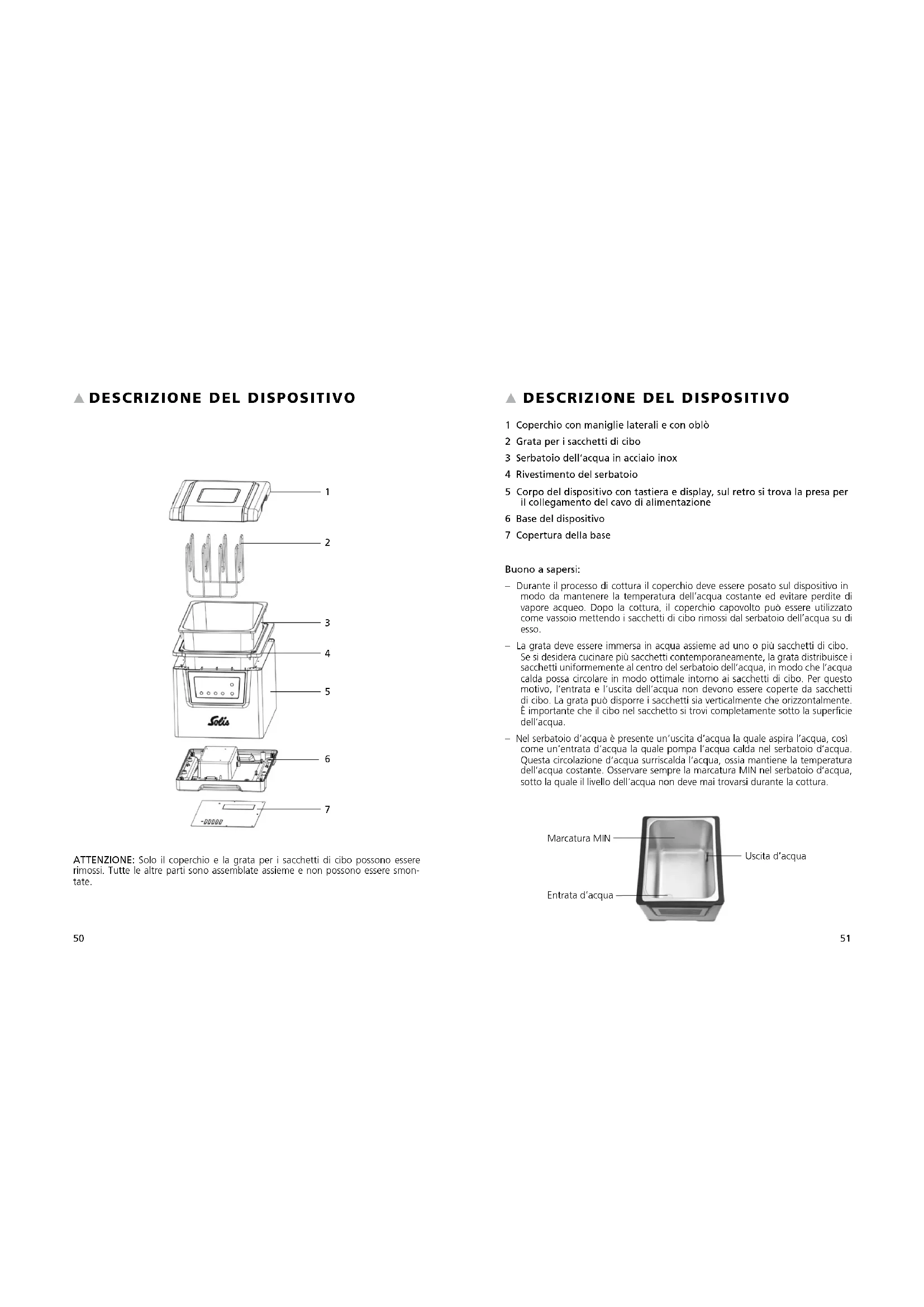 Leggere per cortesia attentamente, prima dell’uso del Suo apparecchio Solis Sous-Vide Cooker Pro, questi istruzioni per l’uso, in modo che Lei conosca bene il Suo apparecchio e possa utilizzarlo in modo corretto. Noi Le consigliamo di conservare accuratamente queste istruzioni ed in caso di un passaggio dell’apparecchio ad un nuovo proprietario. Utilizzando apparecchi elettrici, sono da osservare, per la Sua sicurezza, le seguenti misure di precauzione: