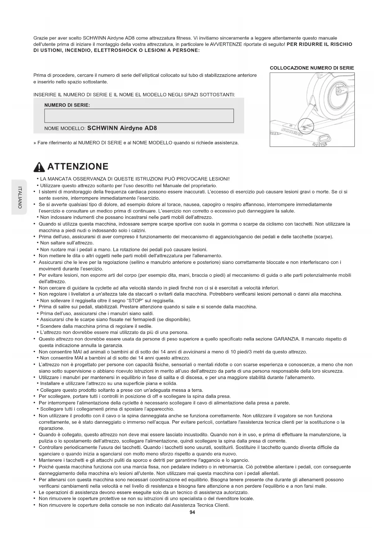 Grazie per aver scelto SCHWINN Airdyne AD8 come attrezzatura fitness. Vi invitiamo sinceramente a leggere attentamente questo manuale dell'utente prima di iniziare il montaggio della vostra attrezzatura, in particolare le AVVERTENZE riportate di seguito! PER RIDURRE IL RISCHIO DI USTIONI, INCENDIO, ELETTROSHOCK O LESIONI A PERSONE: