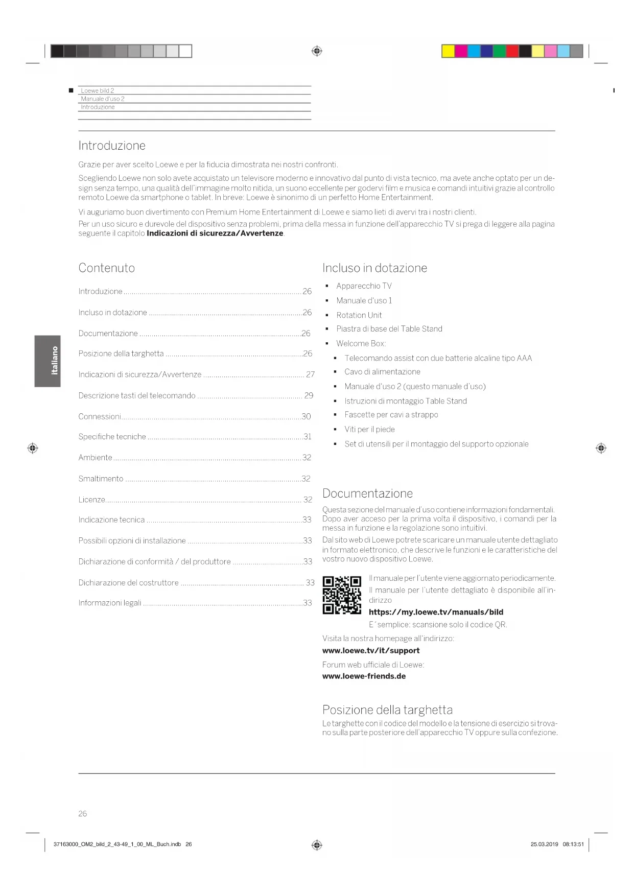 - Informazioni legali Incluso in dotazione Apparecchio TV Manuale d‘uso 1 Rotation Unit Piastra di base del Table Stand Welcome Box: Telecomando assist con due batterie alcaline tipo AAA Cavo di alimentazione Manuale d‘uso 2 (questo manuale d’uso) Istruzioni di montaggio Table Stand Fascette per cavi a strappo Viti per il piede Set di utensili per il montaggio del supporto opzionale Documentazione Questa sezione del manuale d’uso contiene informazioni fondamentali. Dopo aver acceso per la prima volta il dispositivo, i comandi per la messa in funzione e la regolazione sono intuitivi. Dal sito web di Loewe potrete scaricare un manuale utente dettagliato in formato elettronico, che descrive le funzioni e le caratteristiche del vostro nuovo dispositivo Loewe. Il manuale per l’utente viene aggiornato periodicamente. Il manuale per l’utente dettagliato è disponibile all’in- dirizzo https://my.loewe.tv/manuals/bild E´semplice: scansione solo il codice QR. Visita la nostra homepage all‘indirizzo: www.loewe.tv/it/support Forum web ufficiale di Loewe: www.loewe-friends.de Posizione della targhetta Le targhette con il codice del modello e la tensione di esercizio si trova- no sulla parte posteriore dell’apparecchio TV oppure sulla confezione. p. 33