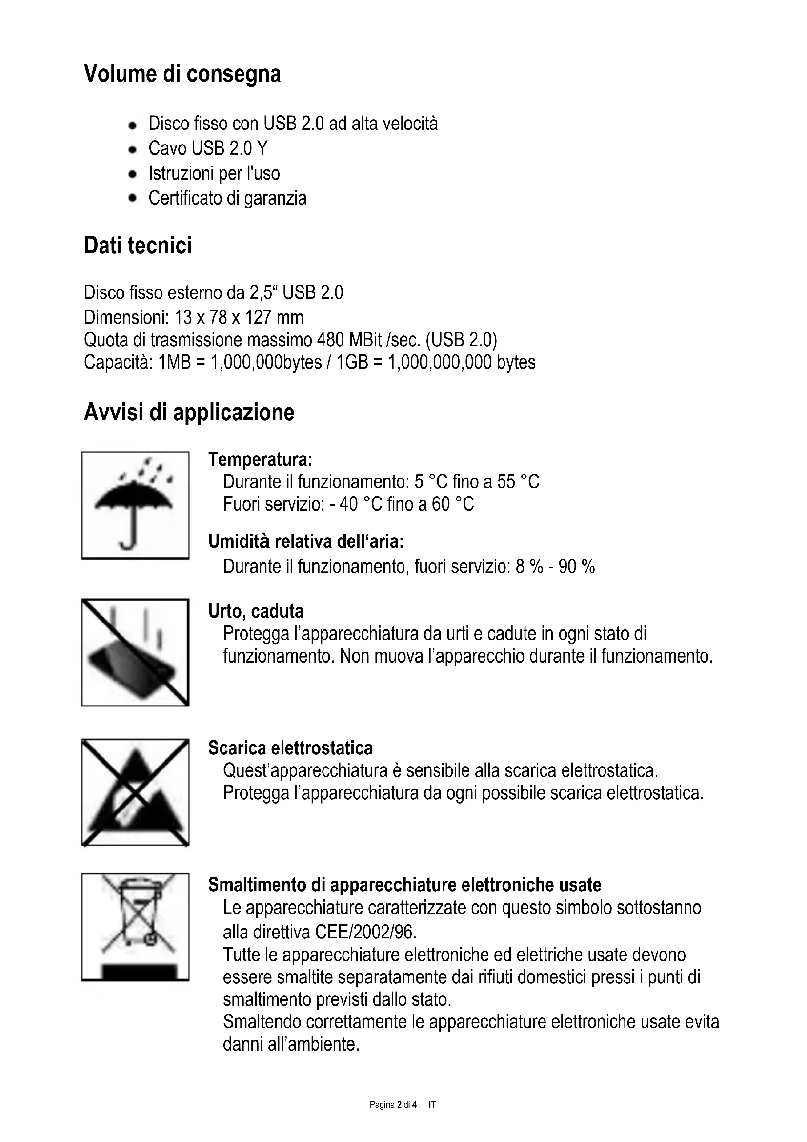 2,5“ MEMORYSTATIONPagina 2 di 4 IT Volume di consegna Disco fisso con USB 2.0 ad alta velocità Cavo USB 2.0 Y Istruzioni per l'uso Certificato di garanzia Dati tecnici Disco fisso esterno da 2,5“ USB 2.0 Dimensioni: 13 x 78 x 127 mm Quota di trasmissione massimo 480 MBit /sec. (USB 2.0) Capacità: 1MB = 1,000,000bytes / 1GB = 1,000,000,000 bytes Avvisi di applicazione Temperatura: Durante il funzionamento: 5 °C fino a 55 °C Fuori servizio: - 40 °C fino a 60 °C Umidità relativa dell‘aria: Durante il funzionamento, fuori servizio: 8 % - 90 % Urto, caduta Protegga l’apparecchiatura da urti e cadute in ogni stato di funzionamento. Non muova l’apparecchio durante il funzionamento.