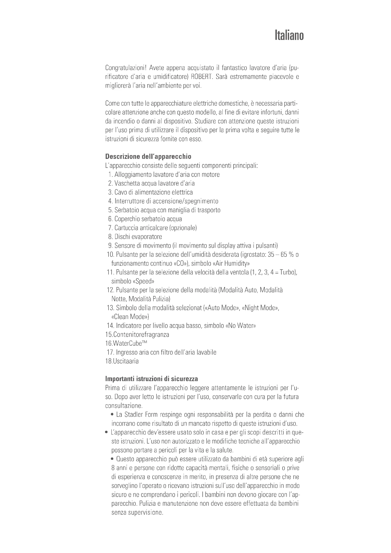 Scarica le istruzioni per il tuo Umidificatore in formato PDF gratuitamente! Trova il tuo manuale Robert - STADLER FORM e riprendi in mano il tuo dispositivo elettronico. In questa pagina sono pubblicati tutti i documenti necessari per l'utilizzo del tuo dispositivo. Robert del marchio STADLER FORM.
