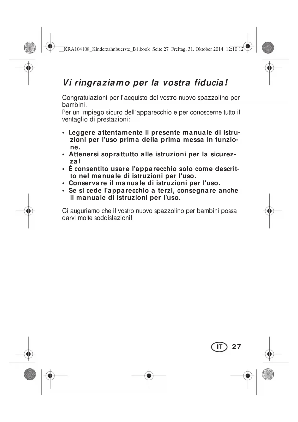 - Se si cede l'apparecchio a terzi, consegnare anche il manuale di istruzioni per l'uso. Ci auguriamo che il vostro nuovo spazzolino per bambini possa darvi molte soddisfazioni! __KRA104108_Kinderzahnbuerste_B1.book Seite 27 Freitag, 31. Oktober 2014 12:10 1228
