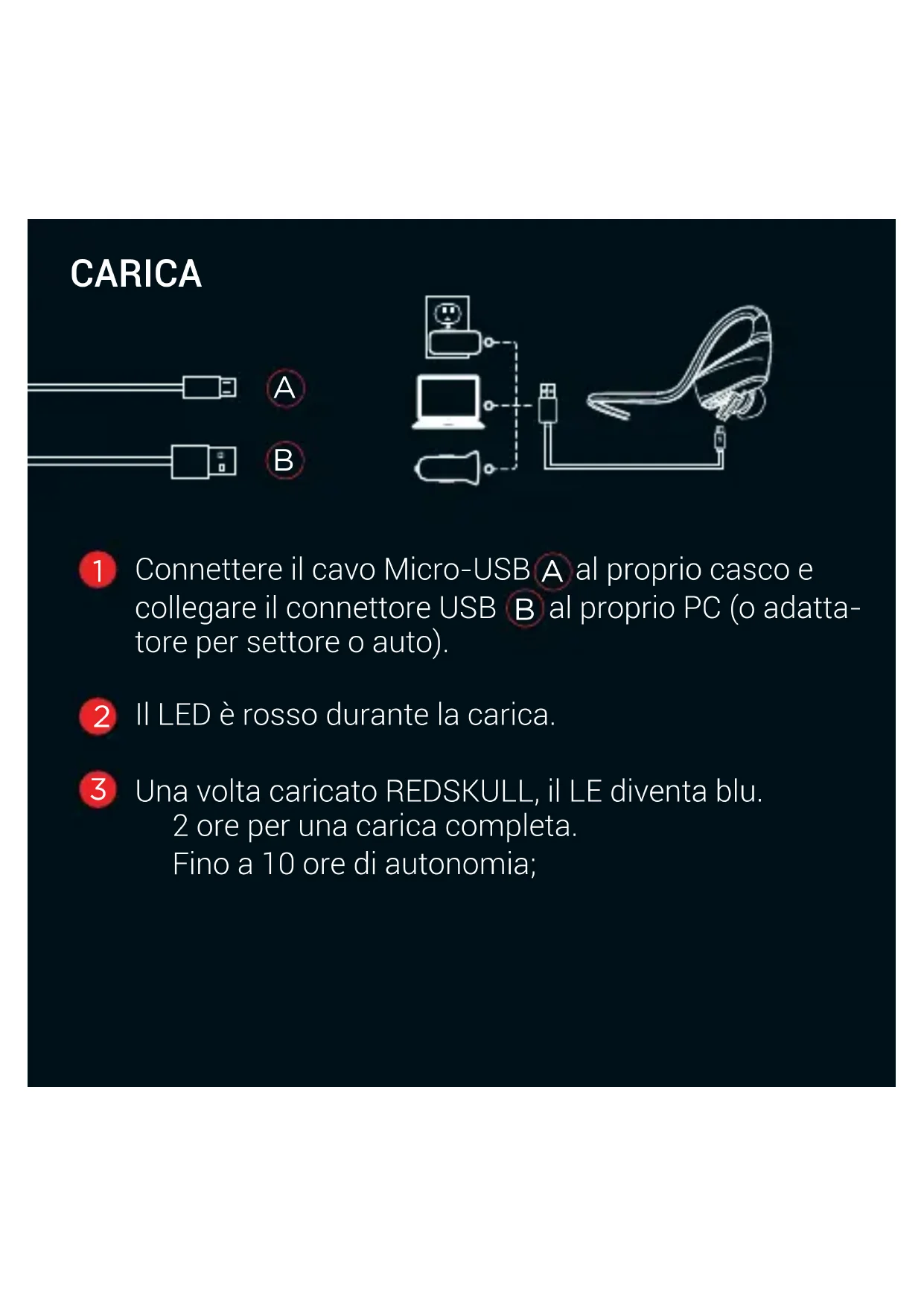 3 Una volta caricato REDSKULL, il LE diventa blu. 2 ore per una carica completa. Fino a 10 ore di autonomia;