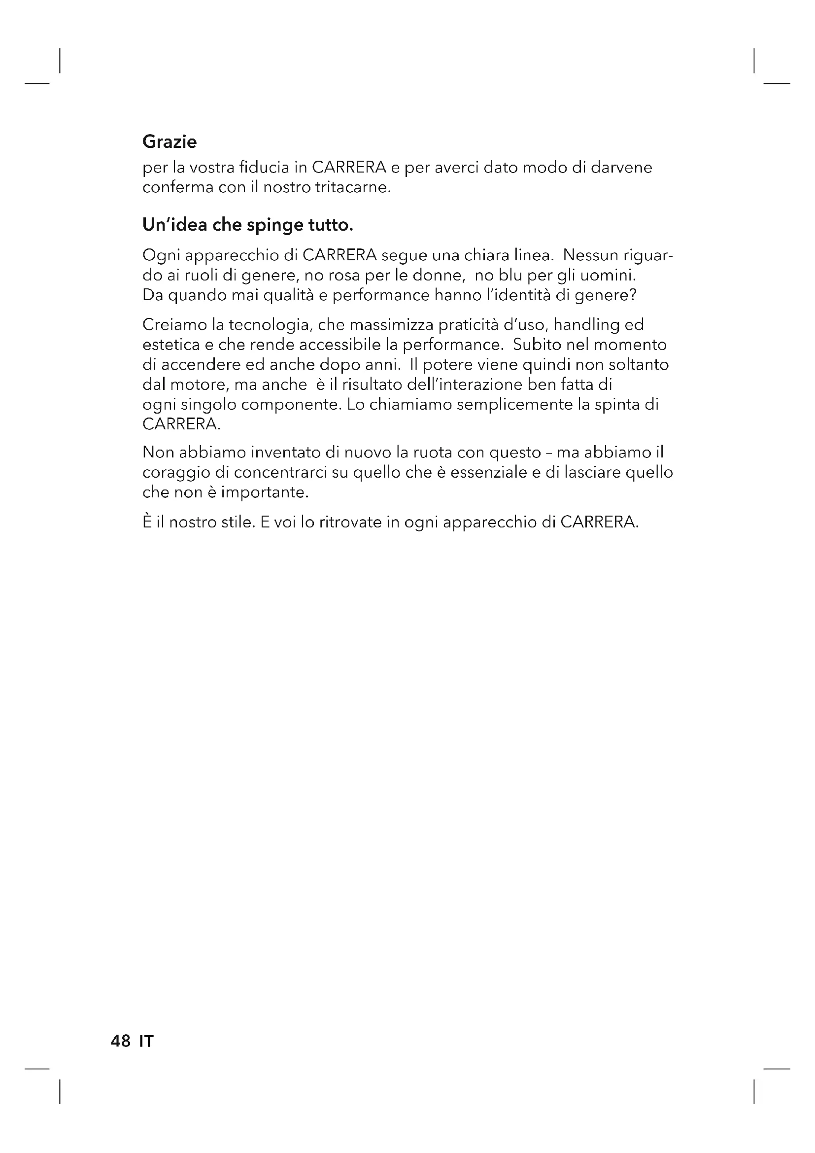 Grazie per la vostra fiducia in CARRERA e per averci dato modo di darvene conferma con il nostro tritacarne. Un’idea che spinge tutto. Ogni apparecchio di CARRERA segue una chiara linea. Nessun riguar- do ai ruoli di genere, no rosa per le donne, no blu per gli uomini. Da quando mai qualità e performance hanno l’identità di genere? Creiamo la tecnologia, che massimizza praticità d‘uso, handling ed estetica e che rende accessibile la performance. Subito nel momento di accendere ed anche dopo anni. Il potere viene quindi non soltanto dal motore, ma anche è il risultato dell’interazione ben fatta di ogni singolo componente. Lo chiamiamo semplicemente la spinta di CARRERA. Non abbiamo inventato di nuovo la ruota con questo – ma abbiamo il coraggio di concentrarci su quello che è essenziale e di lasciare quello che non è importante. È il nostro stile. E voi lo ritrovate in ogni apparecchio di CARRERA.49