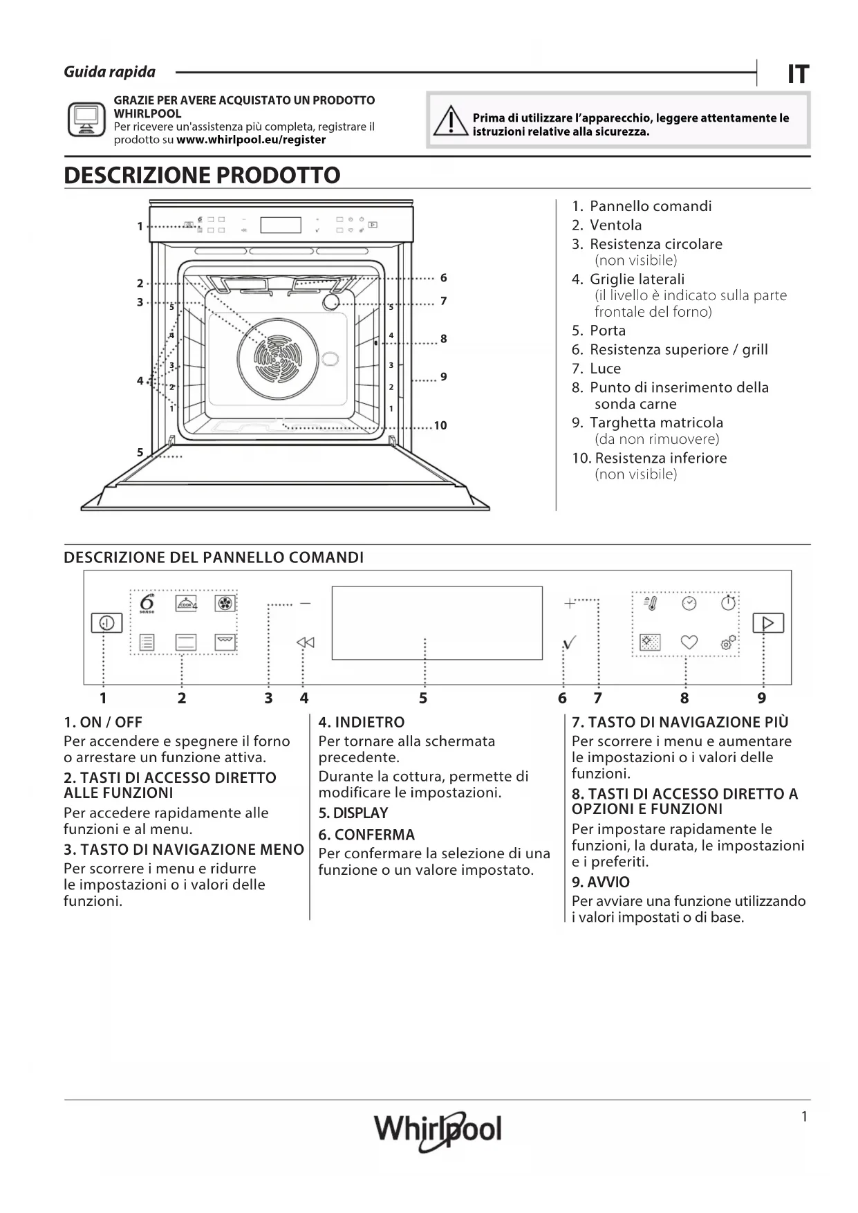 WHIRLPOOL Per ricevere un'assistenza più completa, registrare il prodotto su www . whirlpool . eu/ register Prima di utilizzare l’apparecchio, leggere attentamente le istruzioni relative alla sicurezza. DESCRIZIONE PRODOTTO