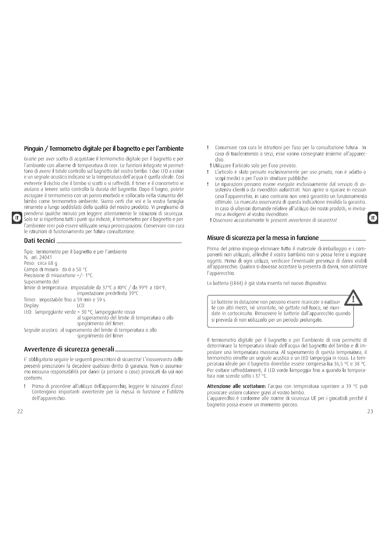 Grazie per aver scelto di acquistare il termometro digitale per il bernet e per l'ambiente con allarme di temperatura di reer. Le funzioni integrate vi permietono di essere il totale controlo sul bernet del vostro bimbo. I due LED a colori e un segnale acustico indicano se la temperature dell'acqua è quella ideale. Cosi eviterete il rischio che il bimbo si scotti o si raffreddi. Il timer e il cronometro vi aiutano a tenere sostutto controlo la durata del bernet. Dopo il bagno, potete asciugare il termometro con un panno morbido e collocarlo nella stanzetta del bimbo come termometro ambiente. Siamo certi che voi e la sua famiglia rimarrete a lungo soddisfatti della qualità del nostro prodotto. Vi preghiamo di prendervi quale minuto per leggere attendentame le istruzioni di sicurezza. Solo se si rispetto tutti i punti qui indicate, il termometro per il bernet e per l'ambiente reer cui possa essere utilizzato alla preoccupazioni. Conservare con cura le istruzioni di funzionamento per futura consulatoria.