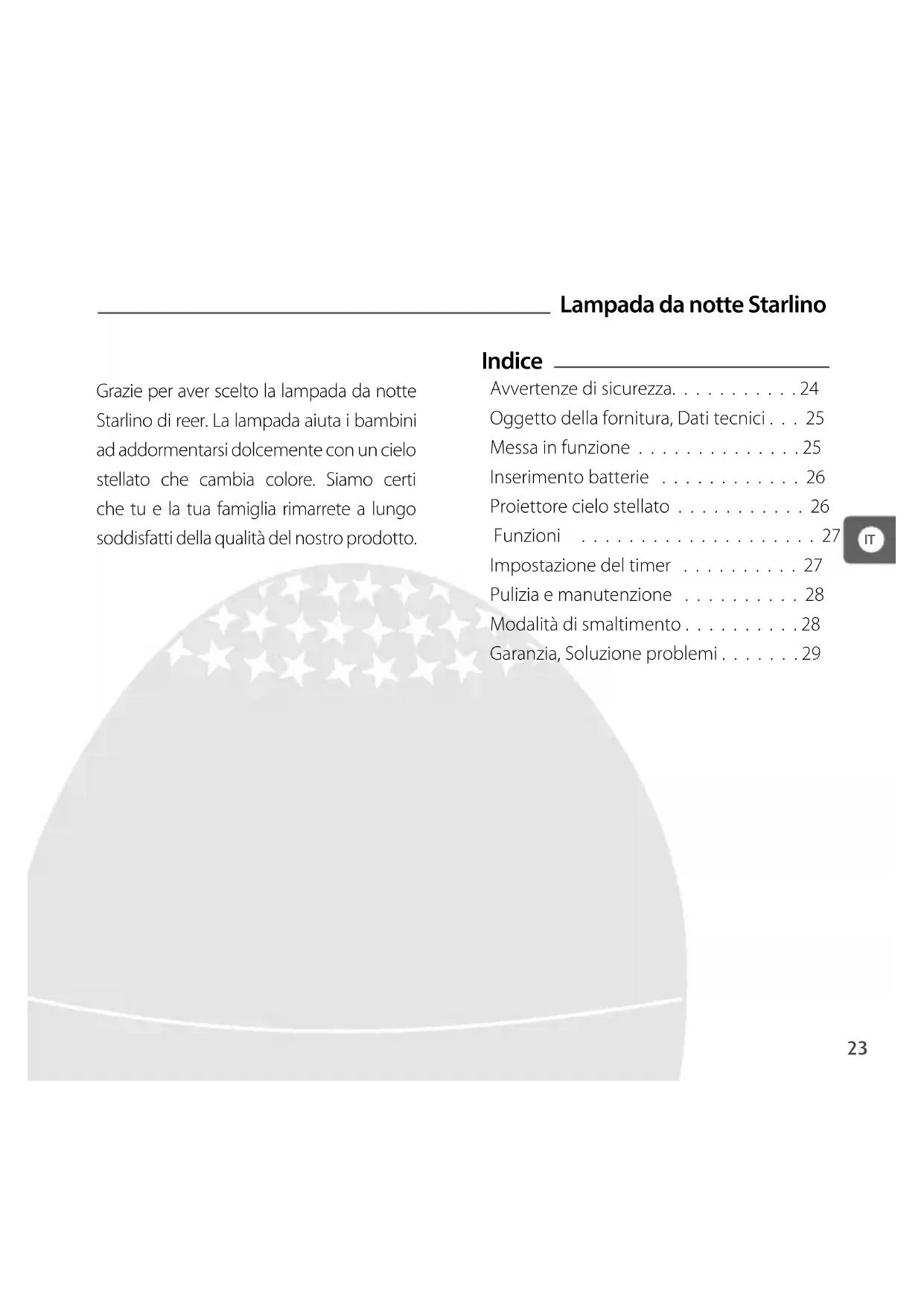 Grazie per aver scelto la lampada da notte Starlino di reer. La lampada aiuta i bambini ad addormentarsi dolcemente con un cielo stellato che cambia colore. Siamo certi che tu e la tua famiglia rimarrete a lungo soddisfatti della qualità del nostro prodotto.