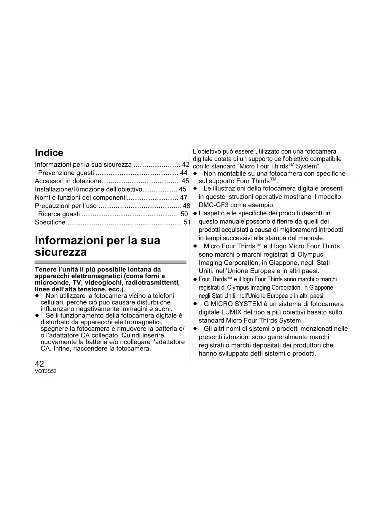 Se tali sostanze vengono a contatto con l’obiettivo possono danneggiarlo o provocare il distacco di vernice. VQT3S52_E.book 48 ページ 2011年8月30日 火曜日 午後5時55分49 VQT3S52 Non lasciare l’unità installata sulla fotocamera mentre la si trasporta. ≥ Non utilizzare e non lasciare mai l’unità nelle seguenti condizioni, per evitare problemi di funzionamento. – Esposta alla luce del sole, o in spiaggia d’estate – Temperatura e umidità elevate o soggette a grossi sbalzi – Elevate concentrazioni di sabbia, polvere o sporco – Dove sono presenti fiamme – Vicino a caloriferi, condizionatori o umidificatori – Dove l’unità può venire a contatto con l’acqua – Dove sono presenti vibrazioni – All’interno di un’auto ≥ Vedere anche le istruzioni per l’uso della fotocamera digitale. ≥ Quando si prevede di non utilizzare l’unità per un periodo prolungato, si consiglia di porvi accanto un disseccante (silica gel). In caso contrario potrebbero verificarsi dei malfunzionamenti dovuti alla presenza di muffe ecc. Si consiglia di controllare il funzionamento dell’unità prima dell’uso. ≥ Non lasciare l’obiettivo a contatto per lungo tempo con prodotti in gomma o in plastica. ≥ Non toccare i contatti elettrici dell’unità. In caso contrario l’unità può guastarsi. ≥ Non smontare o alterare l’unità. VQT3S52_E.book 49 ページ 2011年8月30日 火曜日 午後5時55分50 VQT3S52 Non utilizzare benzina, diluenti, alcol o prodotti simili per pulire l’unità. ≥ L’utilizzo di solventi può danneggiare l’obiettivo o provocare il distacco di vernice. ≥ Rimuovere la polvere o le impronte digitali eventualmente presenti con un panno morbido e asciutto. ≥ Non utilizzare un detergente da cucina o un panno chimico. Quando la fotocamera viene accesa o spenta, si sente un suono. ≥ È il suono provocato dal movimento dell’obiettivo o dell’apertura, e non si tratta di un malfunzionamento. Quando l’obiettivo è installato sulla fotocamera digitale, non disattivare la funzione di stabilizzazione, altrimenti tale funzione non ha effetto. ≥ La funzione Stabilizzatore Ottico di Immagine funziona correttamente solo sulle fotocamere supportate. > Quando si utilizzano fotocamere digitali Panasonic meno recenti (DMC-GF1, DMC-GH1, DMC-G1), [STABILIZZ.] in modalità [REG] non può essere impostato su [OFF]. Si consiglia di aggiornare il firmware della fotocamera digitale sul seguente sito Web. http://panasonic.jp/support/global/cs/dsc/ download/ > Quando si utilizza questo obiettivo con fotocamere digitali di un’altra marca, la funzione Stabilizzatore Ottico di Immagine non sarà disponibile. (Informazioni aggiornate a settembre 2011) Per ulteriori informazioni, contattare il rispettivo produttore. Ricerca guasti VQT3S52_E.book 50 ページ 2011年8月30日 火曜日 午後5時55分51 VQT3S52 Specifiche