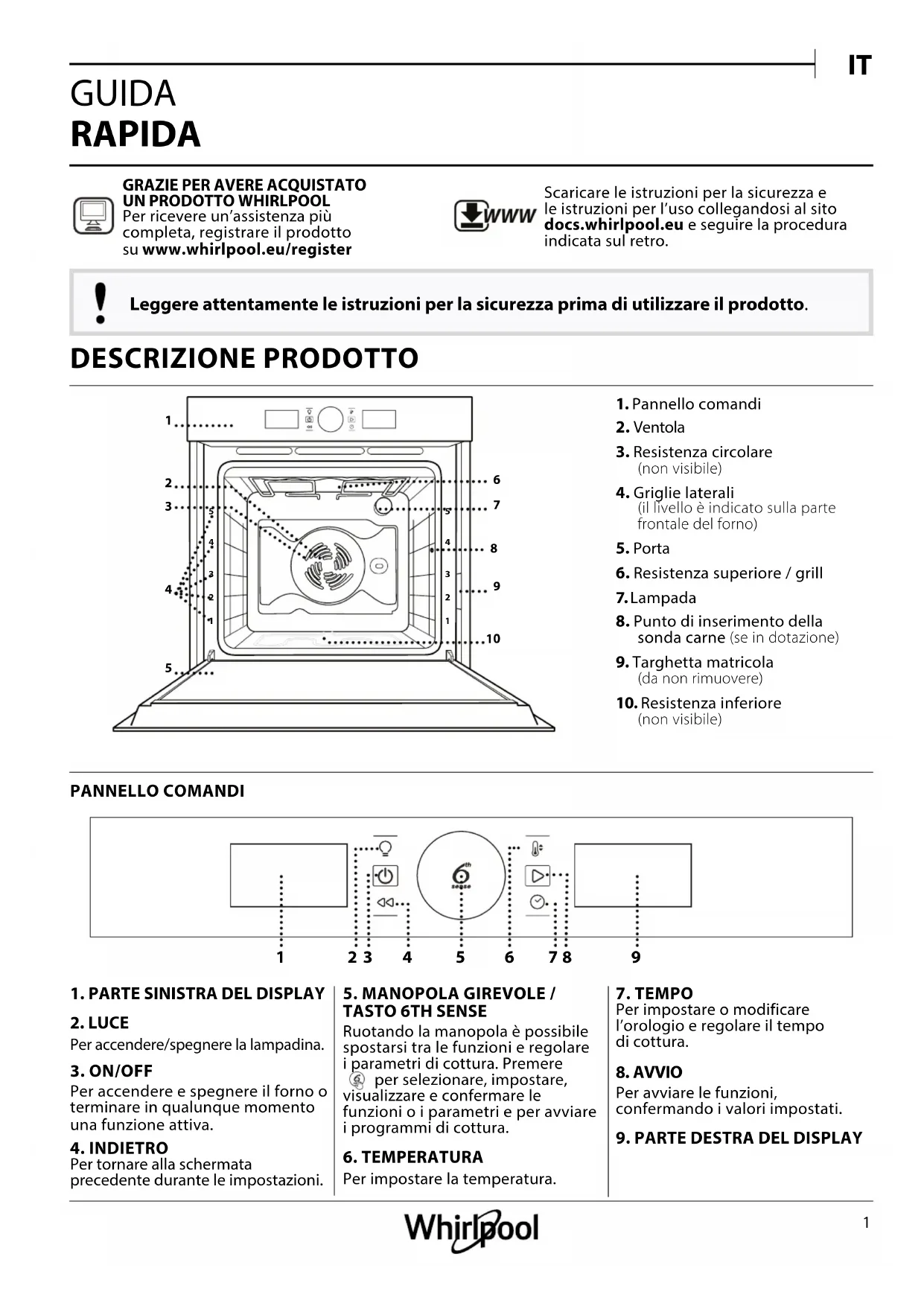 GUIDA RAPIDA Leggere attentamente le istruzioni per la sicurezza prima di utilizzare il prodotto. GRAZIE PER AVERE ACQUISTATO UNPRODOTTO WHIRLPOOLPer ricevere un’assistenza più completa,registrare il prodotto su www.whirlpool.eu/register WWW Scaricare le istruzioni per la sicurezza e le istruzioni per l’uso collegandosi al sito docs.whirlpool.eu e seguire la procedura indicata sul retro.