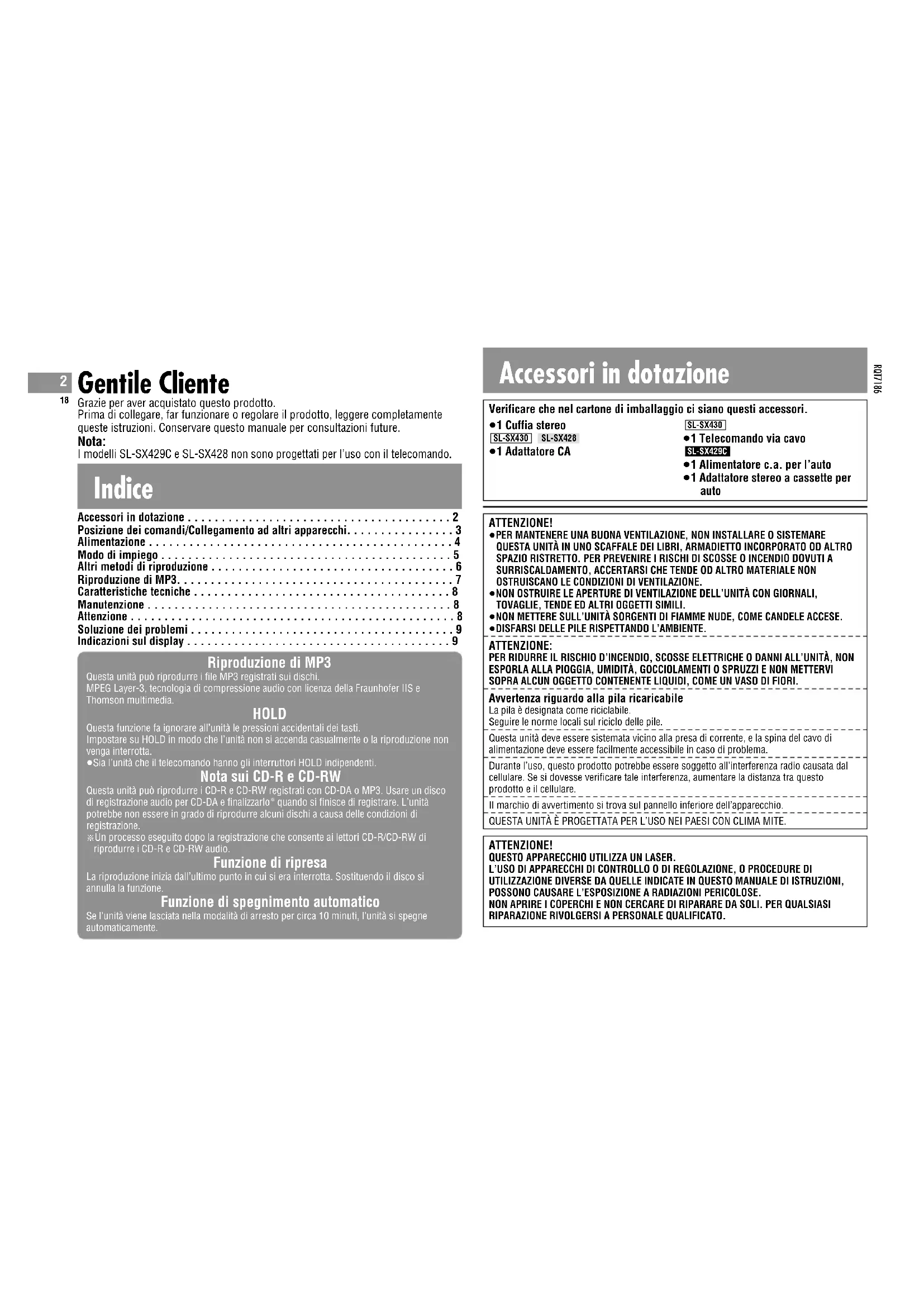 Verificare che nel cartone di imballaggio ci siano questi accessori. Indice Gentile Cliente Grazie per aver acquistato questo prodotto. Prima di collegare, far funzionare o regolare il prodotto, leggere completamente queste istruzioni. Conservare questo manuale per consultazioni future. Nota: I modelli SL-SX429C e SL-SX428 non sono progettati per l’uso con il telecomando. Riproduzione di MP3 Questa unità può riprodurre i file MP3 registrati sui dischi. MPEG Layer-3, tecnologia di compressione audio con licenza della Fraunhofer IIS e Thomson multimedia. HOLD Questa funzione fa ignorare all’unità le pressioni accidentali dei tasti. Impostare su HOLD in modo che l’unità non si accenda casualmente o la riproduzione non venga interrotta. ≥Sia l’unità che il telecomando hanno gli interruttori HOLD indipendenti. Nota sui CD-R e CD-RW Questa unità può riprodurre i CD-R e CD-RW registrati con CD-DA o MP3. Usare un disco di registrazione audio per CD-DA e finalizzarlo