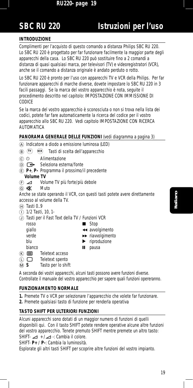 INTRODUZIONE Complimenti per l’acquisto di questo comando a distanza Philips SBC RU 220. Lo SBC RU 220 è progettato per far funzionare facilmente la maggior parte degli apparecchi della casa. Lo SBC RU 220 può sostituire fino a 2 comandi a distanza di quasi qualsiasi marca, per televisori (TV) e videoregistratori (VCR), anche se il comando a distanza originale è andato perduto o rotto. Lo SBC RU 220 è pronto per l’uso con apparecchi TV e VCR della Philips. Per far funzionare apparecchi di marche diverse, dovete impostare lo SBC RU 220 in 3 facili passaggi. Se la marca del vostro apparecchio è nota, seguite il procedimento descritto nel capitolo: IMPOSTAZIONE CON IMMISSIONE DI CODICE Se la marca del vostro apparecchio è sconosciuta o non si trova nella lista dei codici, potete far fare automaticamente la ricerca del codice per il vostro apparecchio allo SBC RU 220. Vedi capitolo IMPOSTAZIONE CON RICERCA AUTOMATICA PANORAMA GENERALE DELLE FUNZIONI (vedi diagramma a pagina 3)